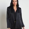 A polished open-front seersucker jacket in black. Sartorial details include strong shoulders and peaked lapels. Seaming tapers style to waist, creating a feminine silhouette. Finished with tonal embossed-dome accent buttons. No closures. Style No. 1750APT-BLAC
