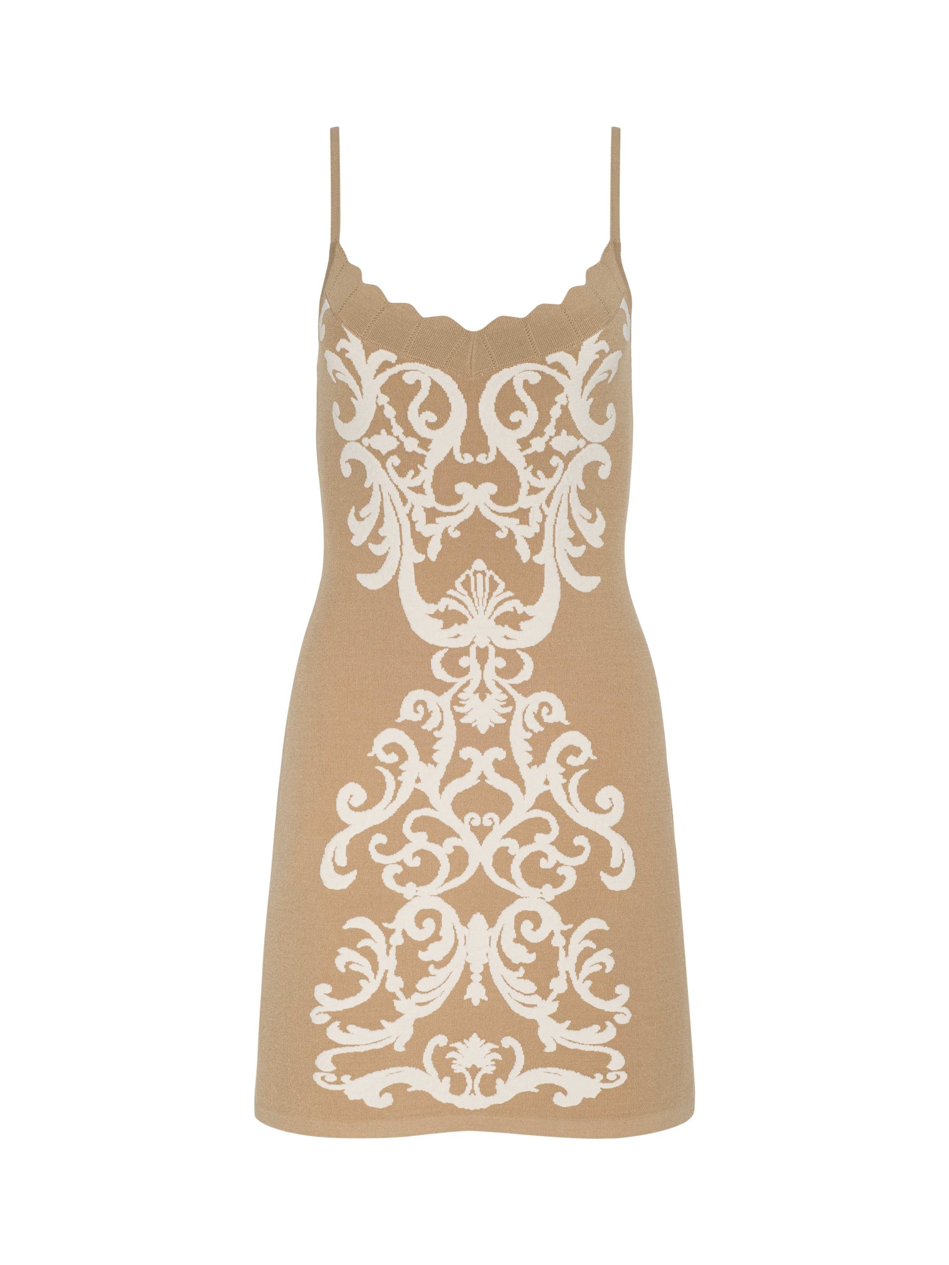 Figure-hugging and flattering, the Bettina mini dress is constructed from an ultra-wearable knit with an intricate jacquard pattern, a defined waist and scalloped neckline. This will be your new go-to for nights out.