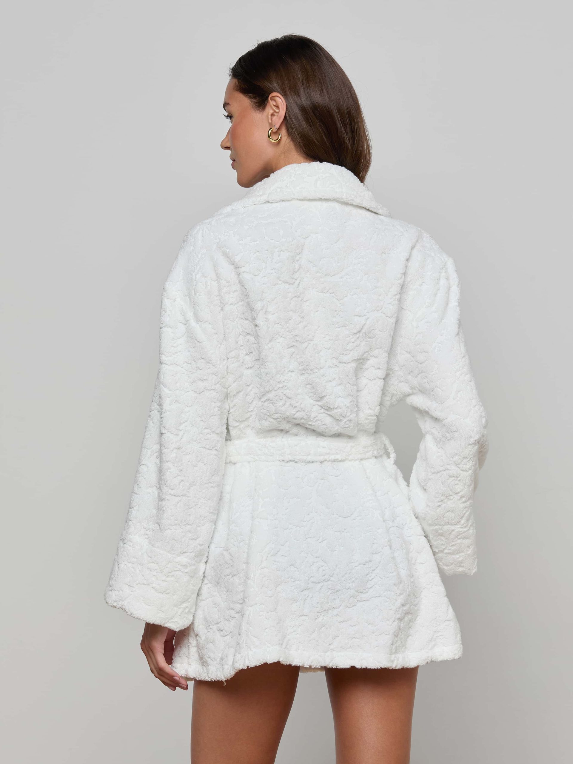 Giving easy elegance for warm days, the Caterina kimono robe in ornate terrycloth is relaxed yet refined. Wide sleeves, pockets, and a self-tie belt complete this versatile piece. Wear it with your favorite swimsuit for instant chic after a morning swim.