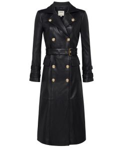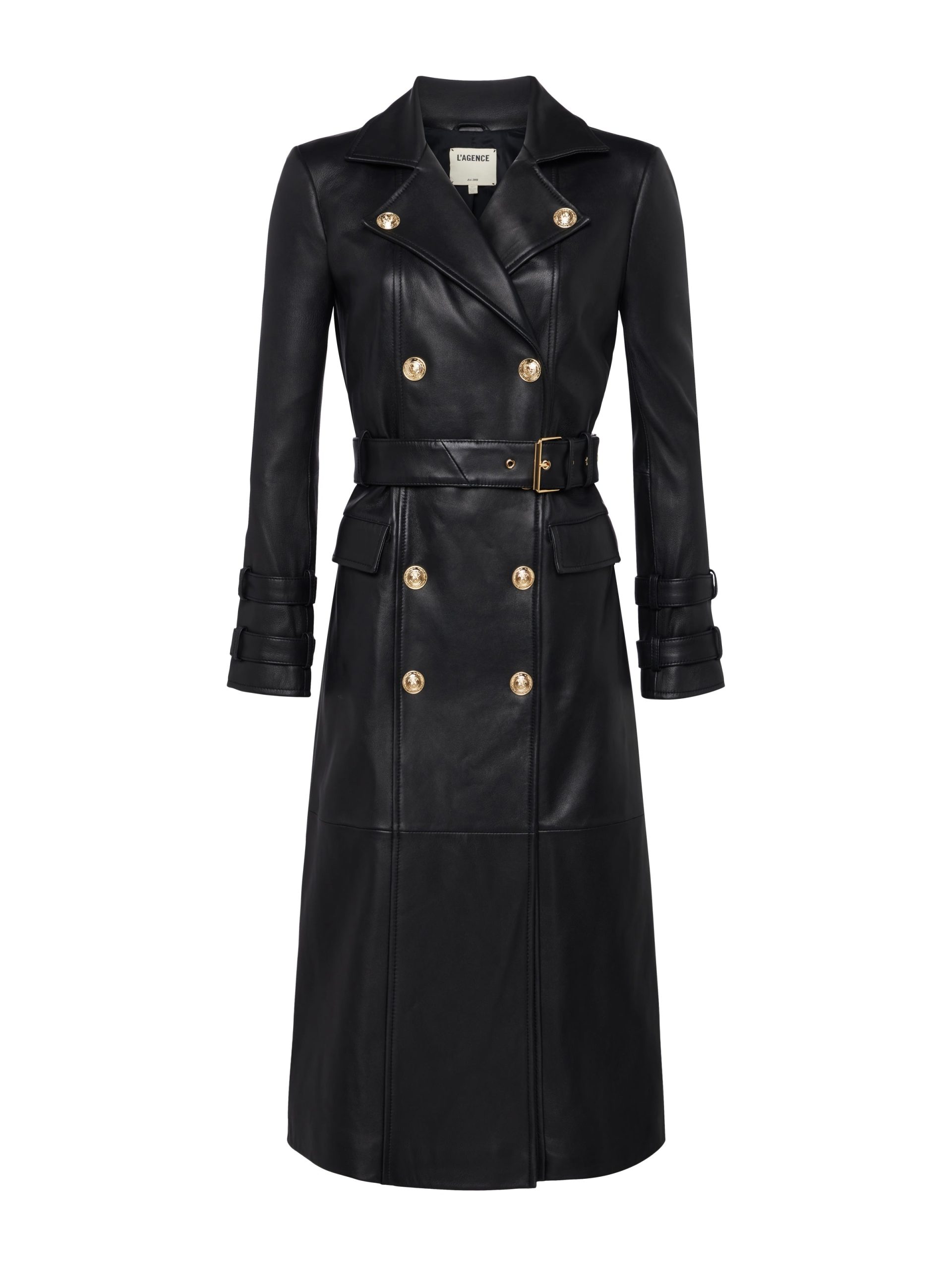 A classic double-breasted trench coat in black leather. With a supple, buttery hand, premium leather style tapers from strong shoulder to waist then drapes in an A-line silhouette to hem. Includes double-belted sleeve with zipper trim, flapped welt pockets, gold embossed-dome accent buttons and detachable buckle belt. Front snap closure. Fully lined. Style No. 1737MLL-BLAC