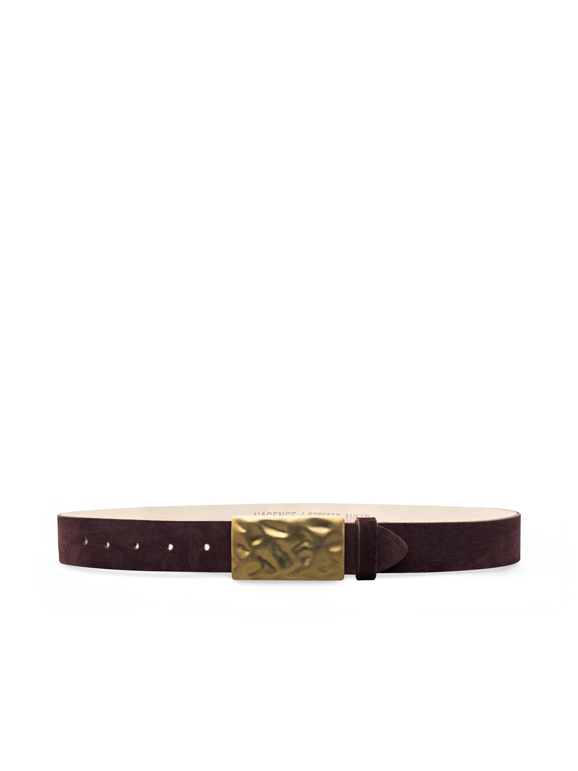 A hammered gold-plated buckle adds organic texture and polish to the clean lines of the Chara belt, handcrafted with a rich burgundy suede strap.