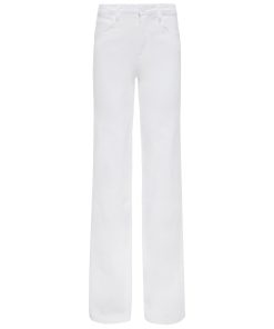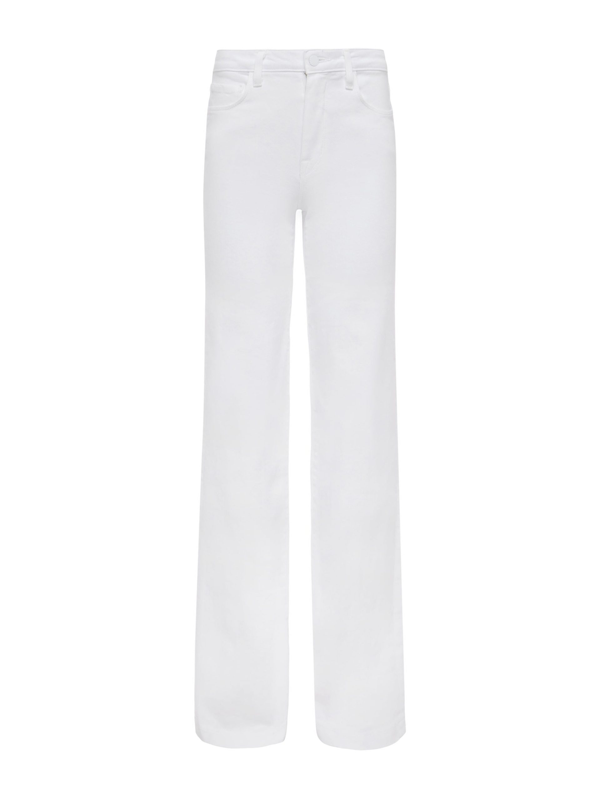 A beautifully proportioned wide-leg high-rise jean in white premium stretch denim. Contoured waistband fits securely at or below natural waist, while supple stretch denim hugs the hip before releasing into a wide leg. Classic five-pocket construction and front zip fly closure with tonal button. Style No. 2790KBO-BLAN