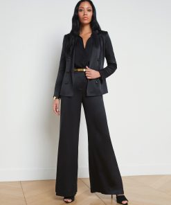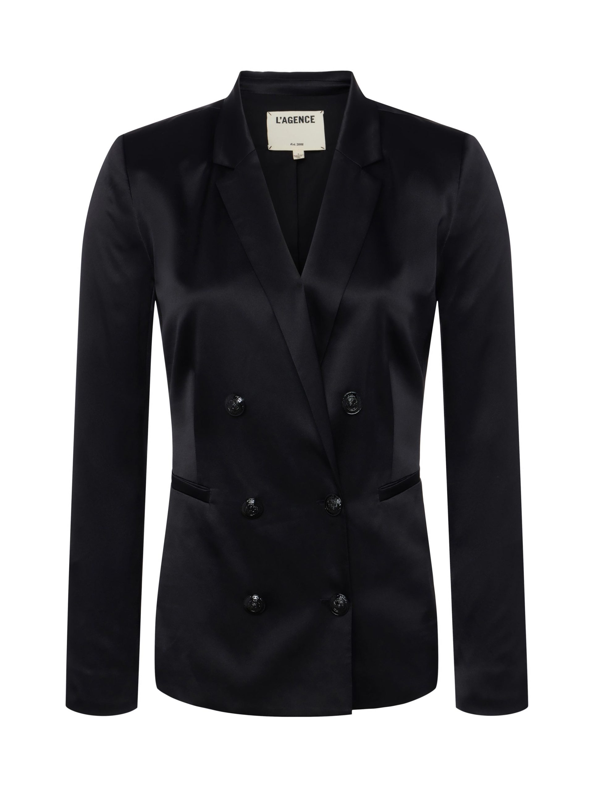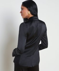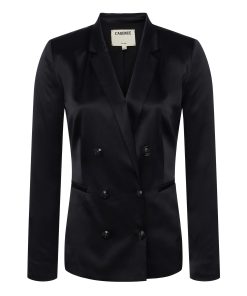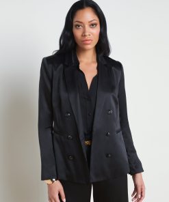 A timeless double-breasted blazer in black silk charmeuse. The fully lined Colin blazer offers tailored appeal with strong shoulders, sleek lapels, and welt pockets. Fastens in front with lustrous embossed-dome buttons. Complete your power suit by pairing with the coordinating Gavin pant. Style No. 1485CHM-BLAC