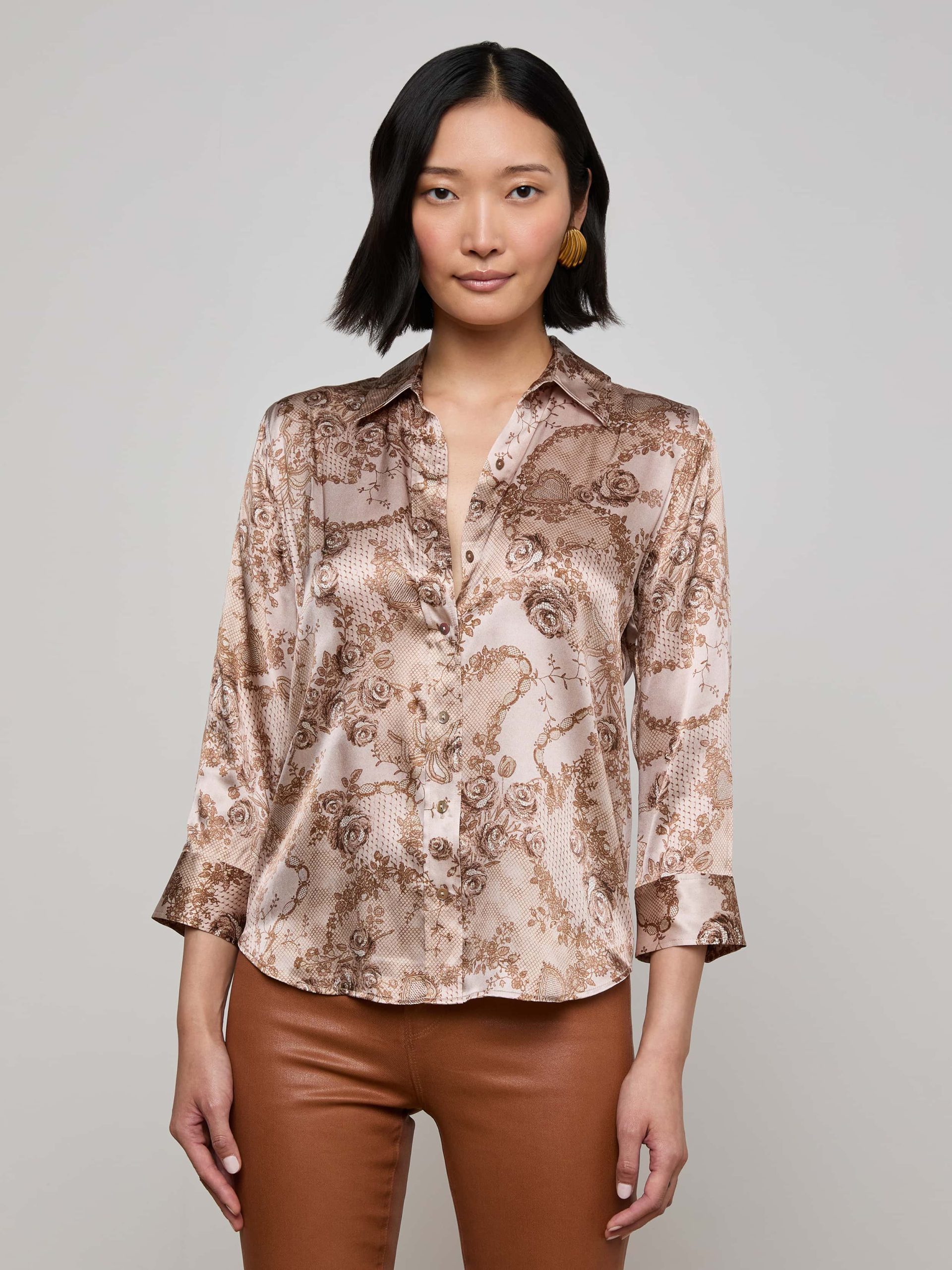 Meet the iconic silk button-down that belongs in every wardrobe. Our signature three-quarter sleeve shirt is back in a floral lace print.