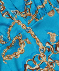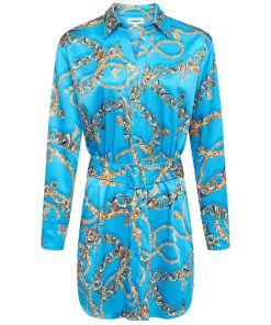 A chic printed shirtdress that delivers polish with minimal effort. Featuring a classic collar, button front, and an adjustable belt for a cinched waist, it goes from desk to drinks with ease. Now in lustrous satin and a vivid blue and gold chain print.