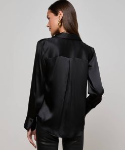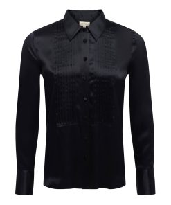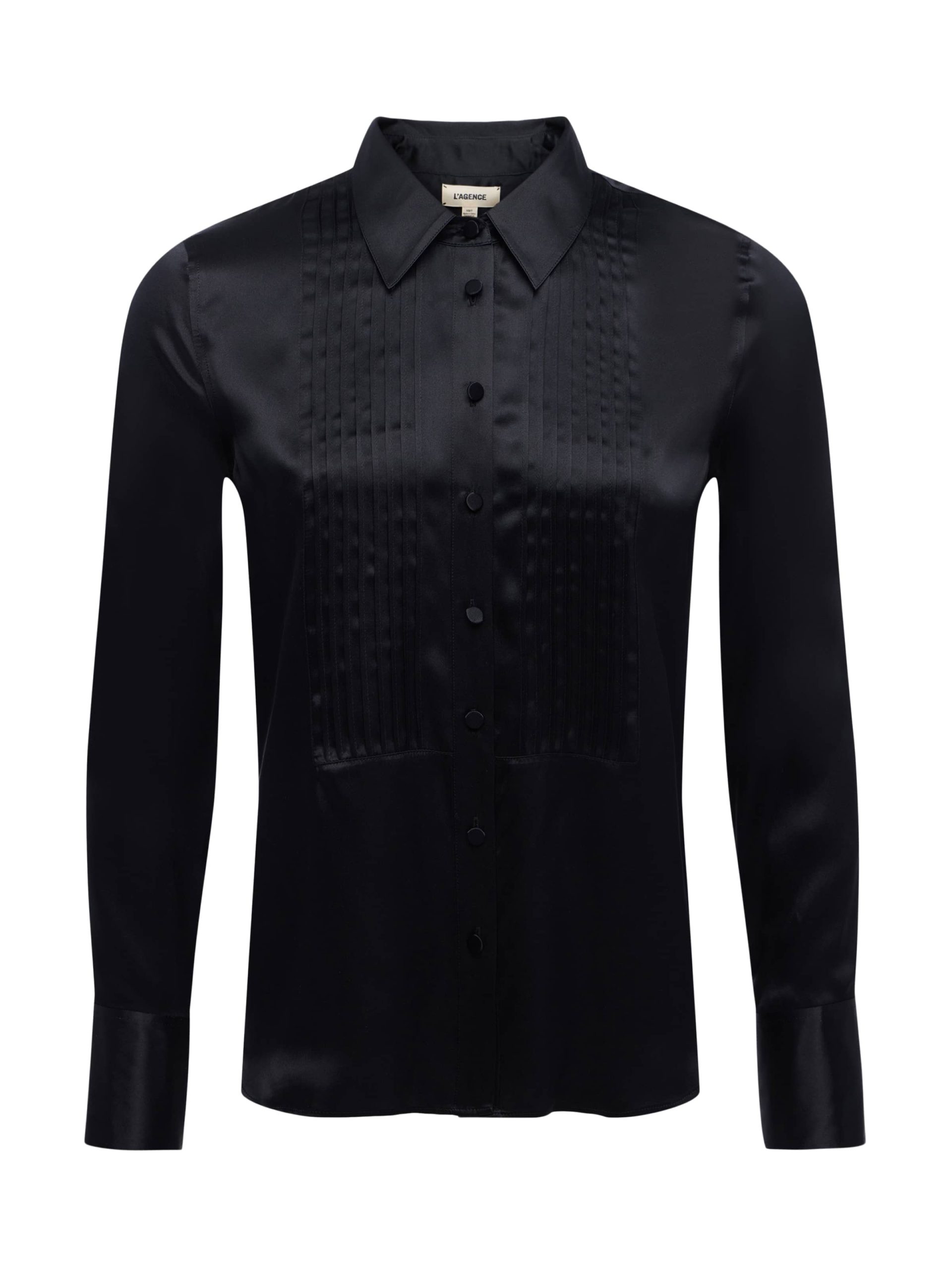 The feminine version of the classic tuxedo shirt, crafted with lustrous silk charmeuse and satin-covered buttons. Now in black.