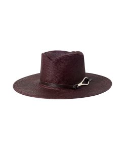 The Estella is an espresso straw hat with a flat brim and pinched crown. A leather band accented with a silver horse bit detail finishes its look.