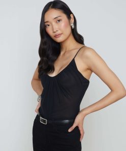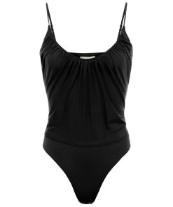 This subtly sexy bodysuit in black belongs in your wardrobe for all four seasons. Ruching adds feminine softness to a deep scoop-neckline. Adjustable straps allow for a fully customizable fit. Stunning on its own with slim denim. Layer under a full suit for a sharp office look. Style No. 40615PRM-BLAC