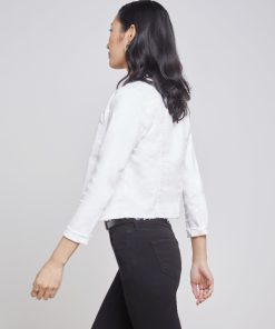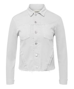 A white denim jacket with a feminine fit and an ultra-soft feel. Luxurious stretch denim hugs the body while allowing complete freedom of movement. Timeless design features a classic collar, double chest pockets, and a front button closure. Slimming tapered seams and a raw, ravaged hem add a modern edge. Style No. 1431KBO-BLAN