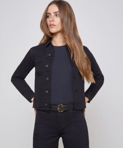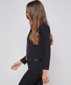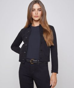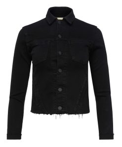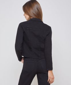 A slim denim jacket in saturated black. A crop cut, front angled seaming and welt pockets define the waist, accentuating an hourglass shape. Includes hems with clean raw edges, double-stitched chest pockets and cuffed three-quarter sleeves. Fastens in front with matte-black buttons. Style No. 1431EKN-SABL