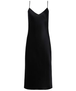 A body skimming slip dress crafted from a chic, silk charmeuse contours to your natural curves with a bias cut for an effortless allure. Adjustable spaghetti straps and a knee length hem balance a sexy silhouette with a soft v-neckline. Style No. 60902CLW-BLAC