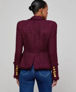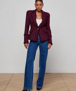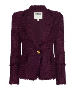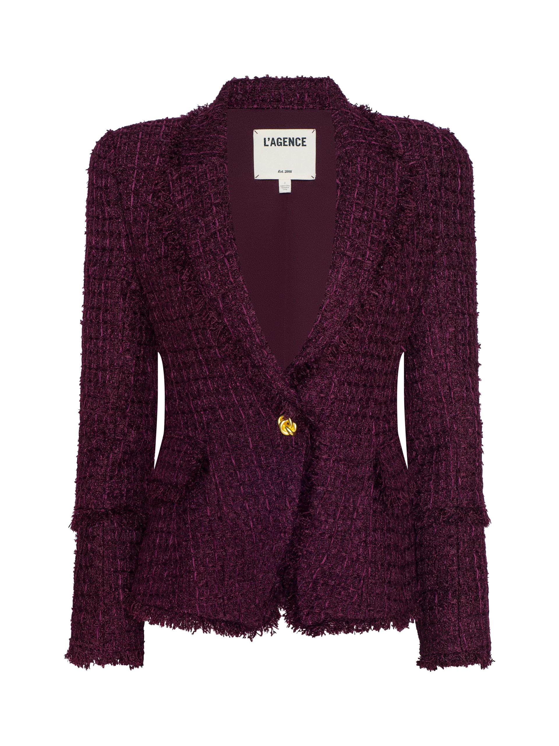 Timeless with a twist, the Kaisley is a tailored tweed blazer that blends classic sophistication with subtle edge. The textured fabric and frayed trims add dimension, while novelty buttons along the cuffs add just the right amount of intrigue. Fitted through the waist, it elevates denim or layers effortlessly over sleek dresses. Now in dark port.