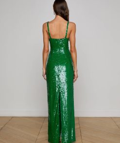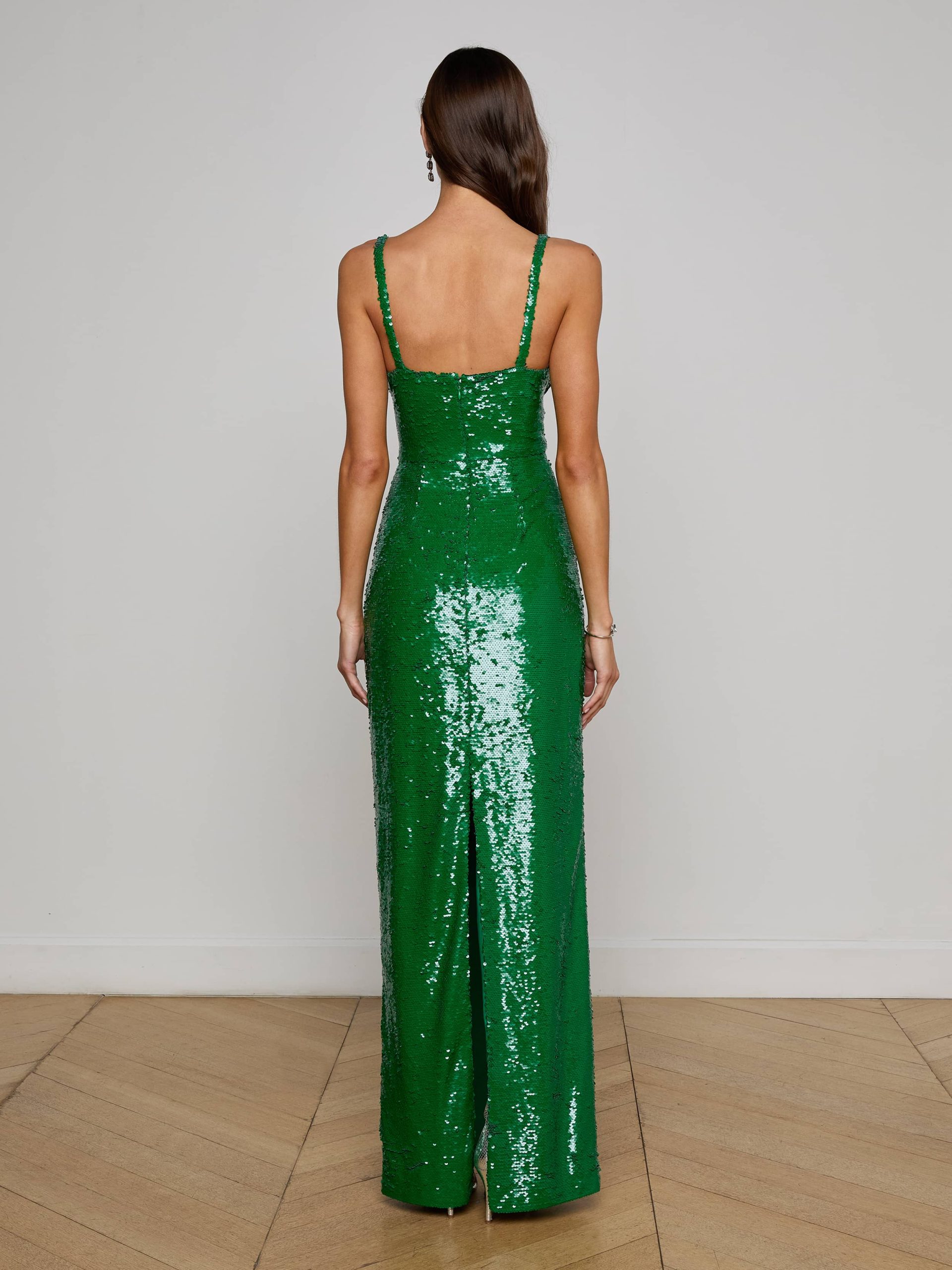 When you wear the Karma dress, good things are bound to come your way. With emerald green allover sequins, it shimmers with a liquid-like sheen. A structured bodice flatters the figure, adding to its wow-factor and a high back slit allows for ease of movement. Perfect for making an impression.