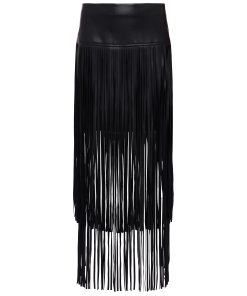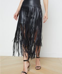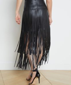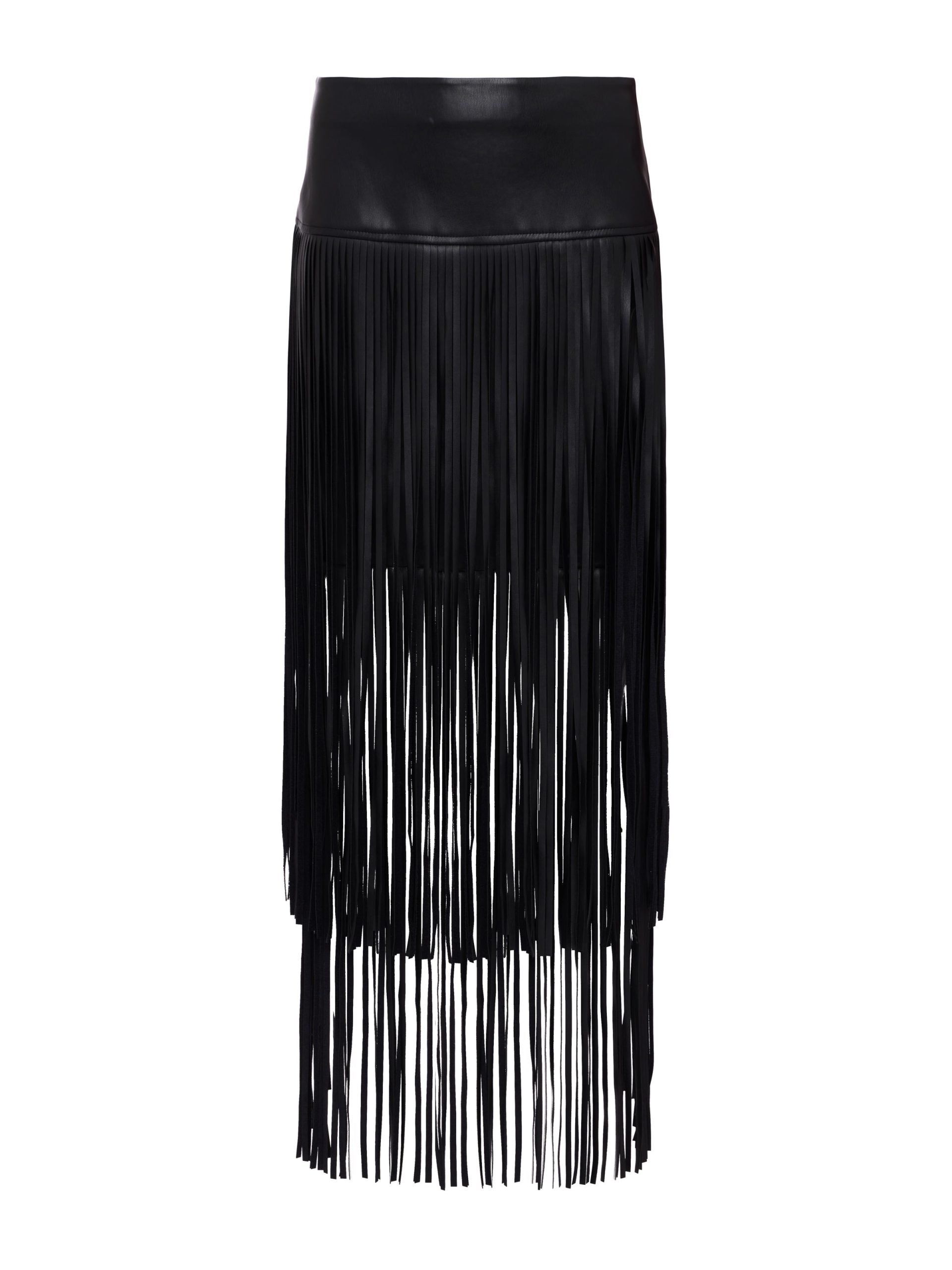 Our newest vegan-leather skirt, updated with extra-long fringe. The Karolina slim-fit miniskirt beguiles with two tiers of fringe that fall to lower calf and offer the ultimate in sexy movement. The deep yoke waist and hidden back zip keep the look flatteringly smooth. Wear with a slim cami and your highest heel for cool club-night style. Try a jacket and short boot for a modern day look. Style No. 3393ZST-BLAC