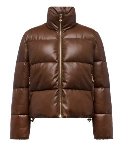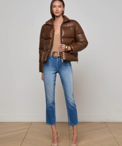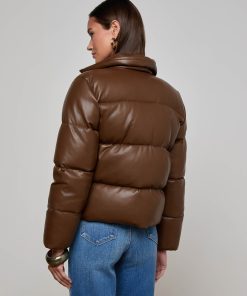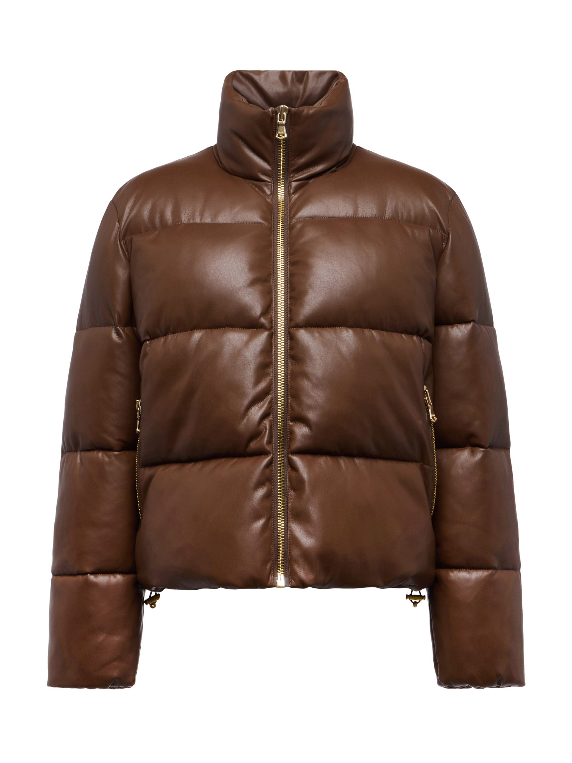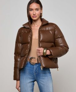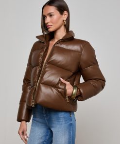 Crafted with high-gloss vegan leather and subtle structure, the Larsen puffer jacket merges volume with sophistication. Gold-tone hardware punctuates the design, adding a luxe finish to the minimalist silhouette.