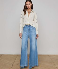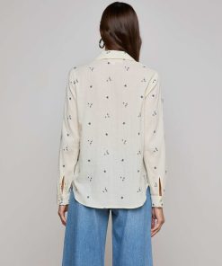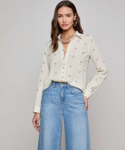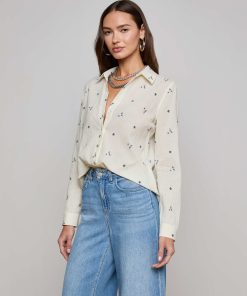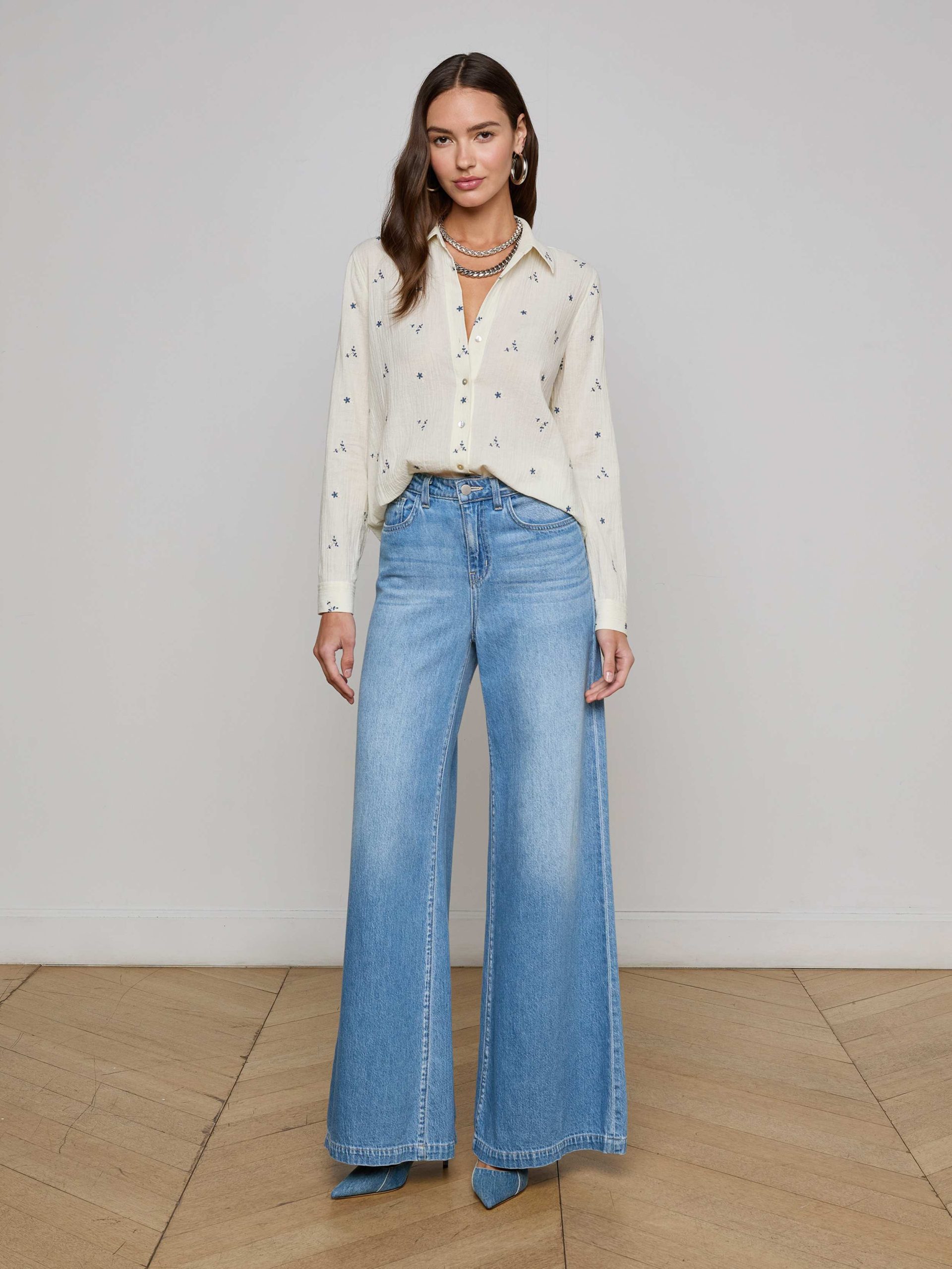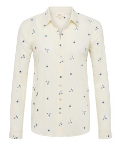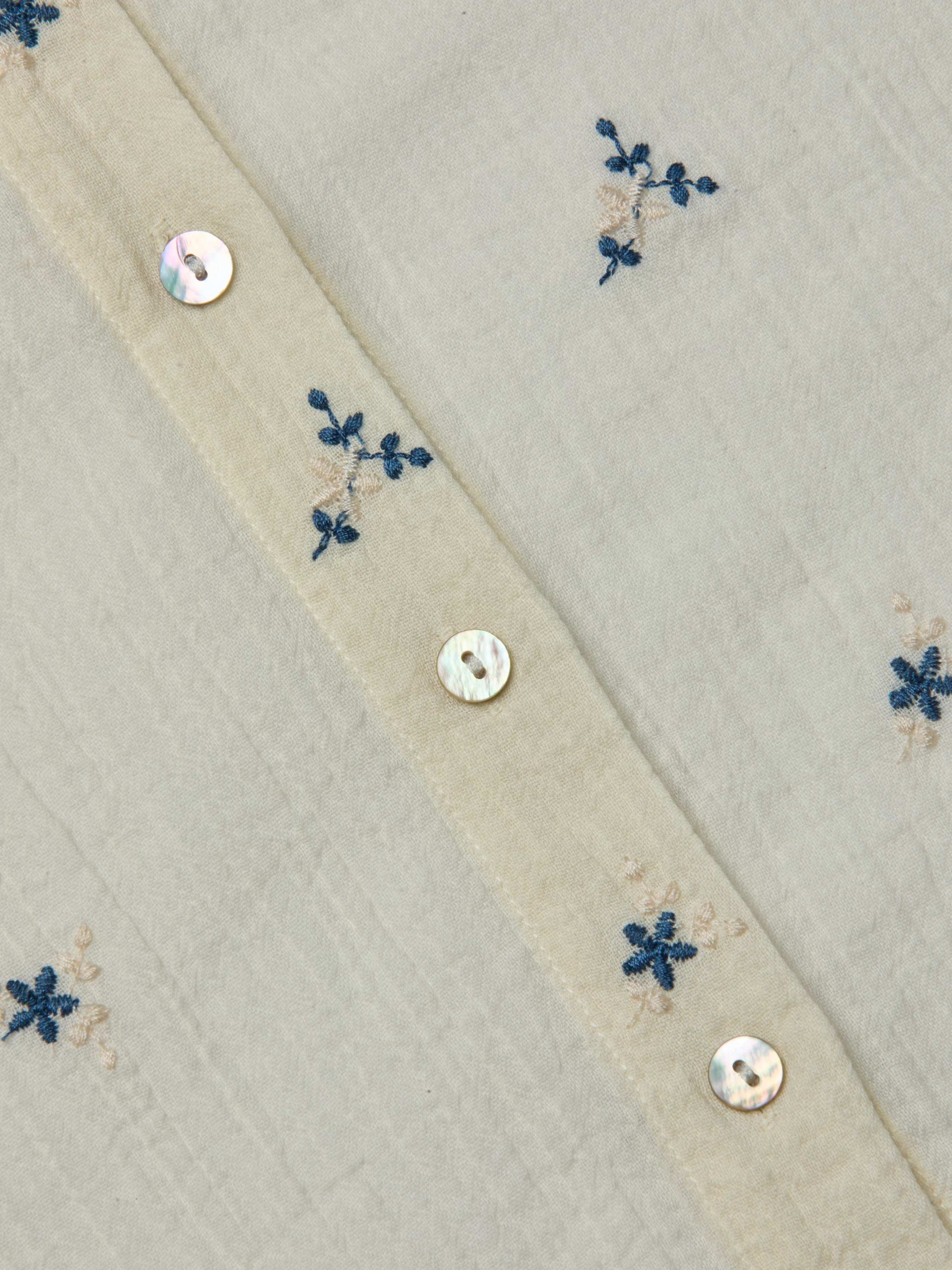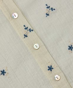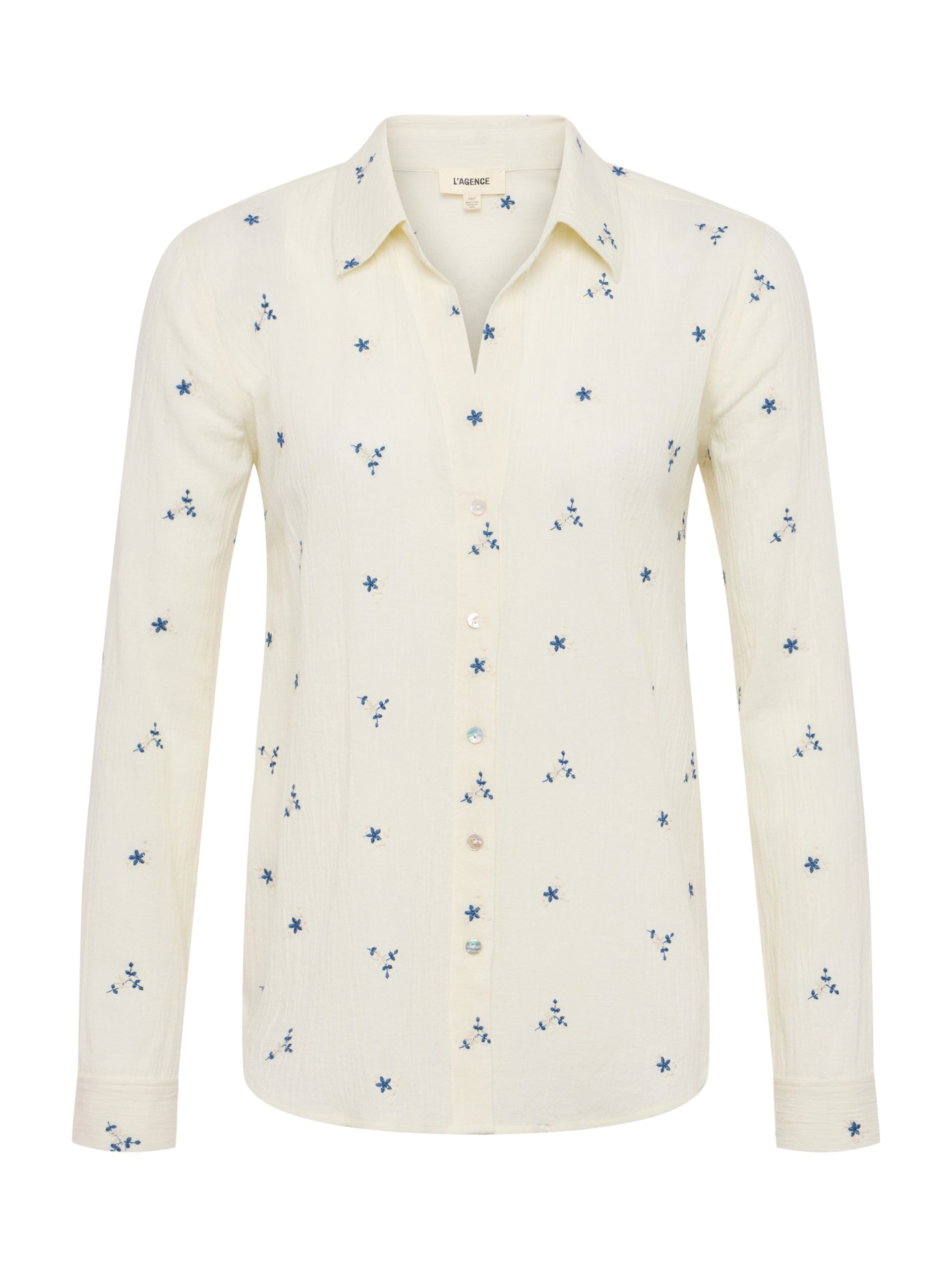 The Laurent is our relaxed fit long sleeve button-down, now in a textured off-white cotton with beautiful blue floral embroidery.