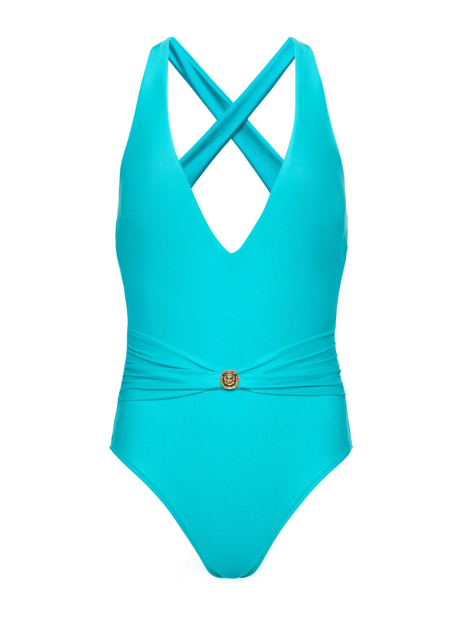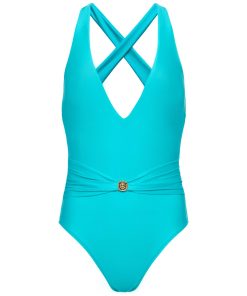 A deep, plunge neckline brings ultra flattering definition to the Lisa one-piece swimsuit. Now in bright aqua.