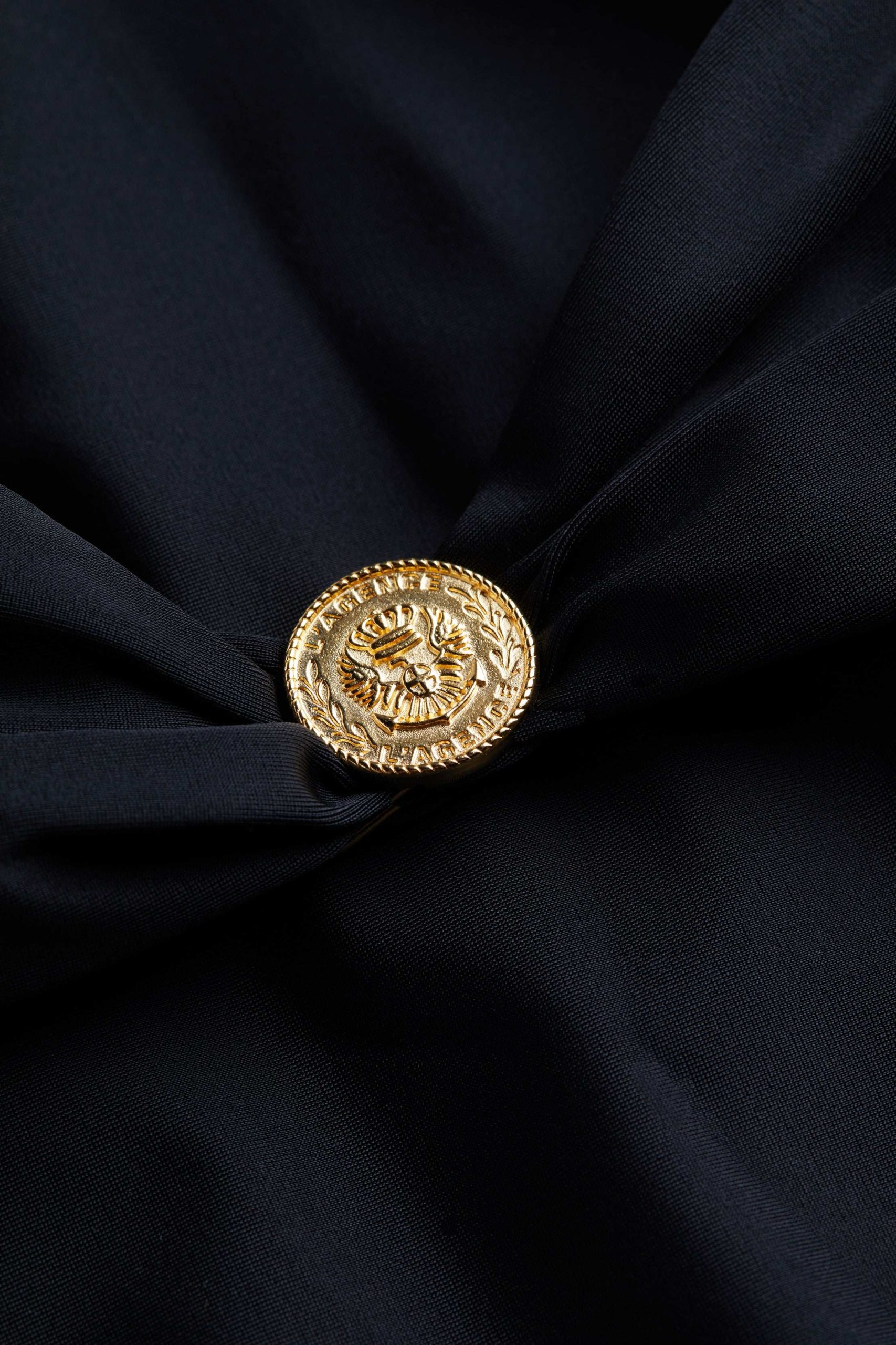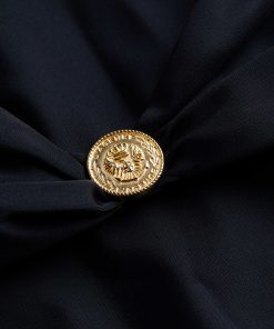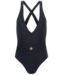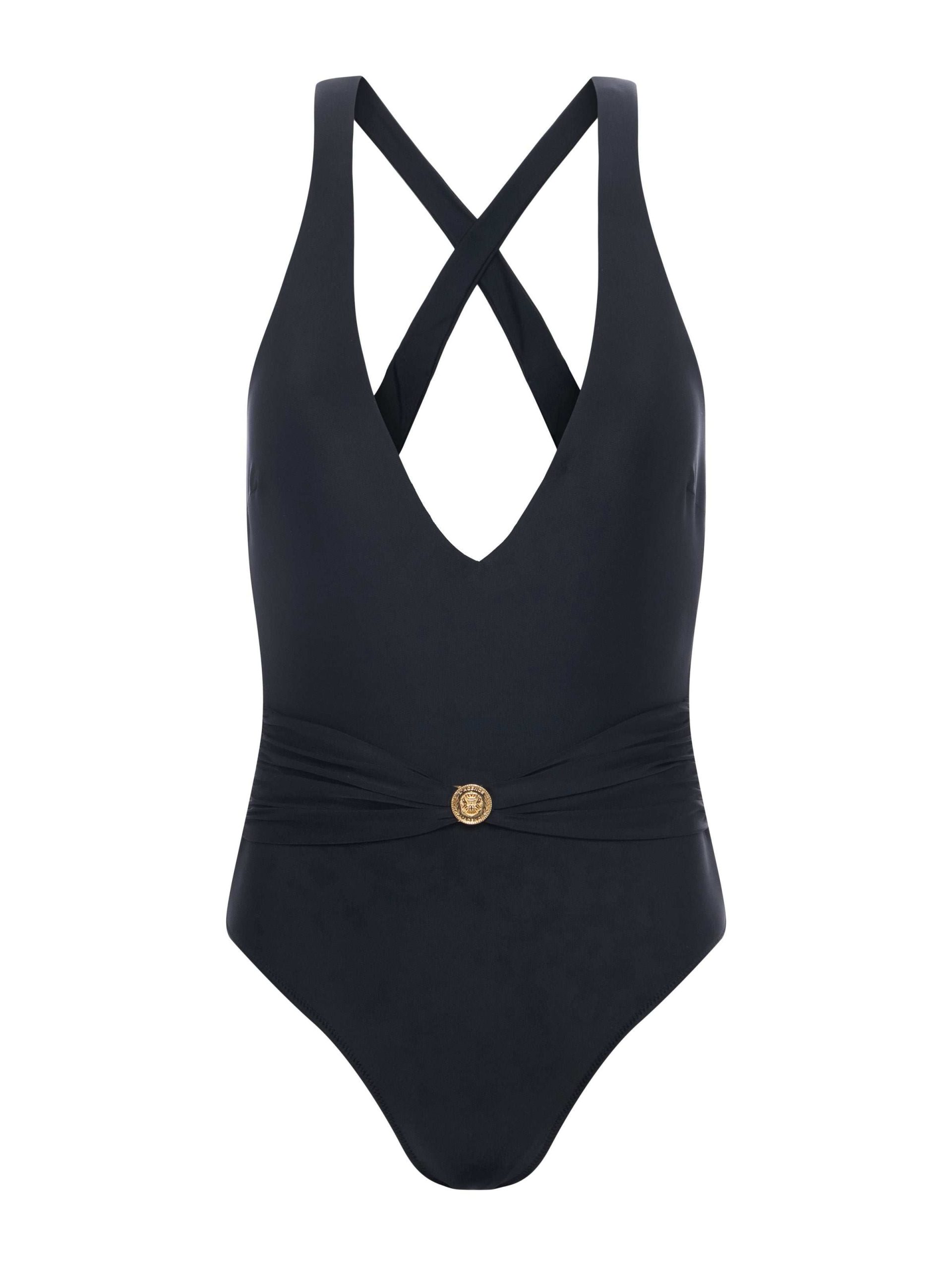 A deep, plunge neckline and ruched waistband add ultra flattering definition to the Lisa one-piece swimsuit. Now in classic black with a gold coin detail.