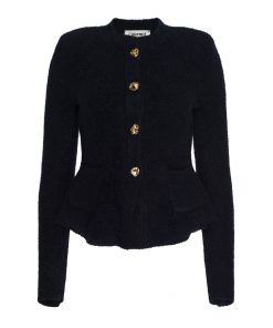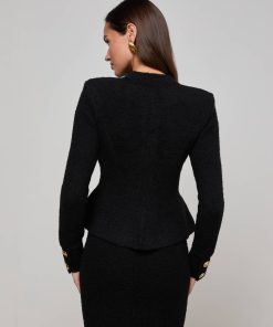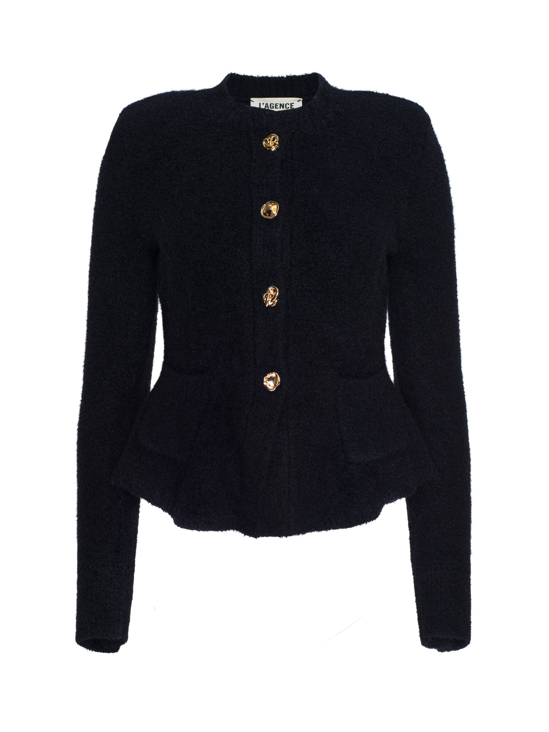 The Melissa cardigan blends soft structure with quiet elegance. Spun in a textured knit, it’s shaped with a sculpted waist and flared hem that flatters the figure. A clean neckline and graceful silhouette channels elegance with a hint of old-world charm while novel accent buttons keep it thoroughly modern. Wear with its coordinating skirt and heels for a polished head-to-toe look.