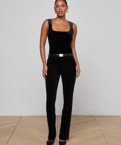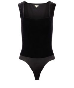 A sleek tank bodysuit in true black. Front square-neck style frames collarbones beautifully. Luxurious stretch velvet hugs curves before extending into a cheeky laser-cut panty that fastens with a two-snap gusset, creating a smooth, line-free look. Sophisticated on its own, it also makes a perfect layering piece under a jacket. Style No. 5637FUW-BLAC