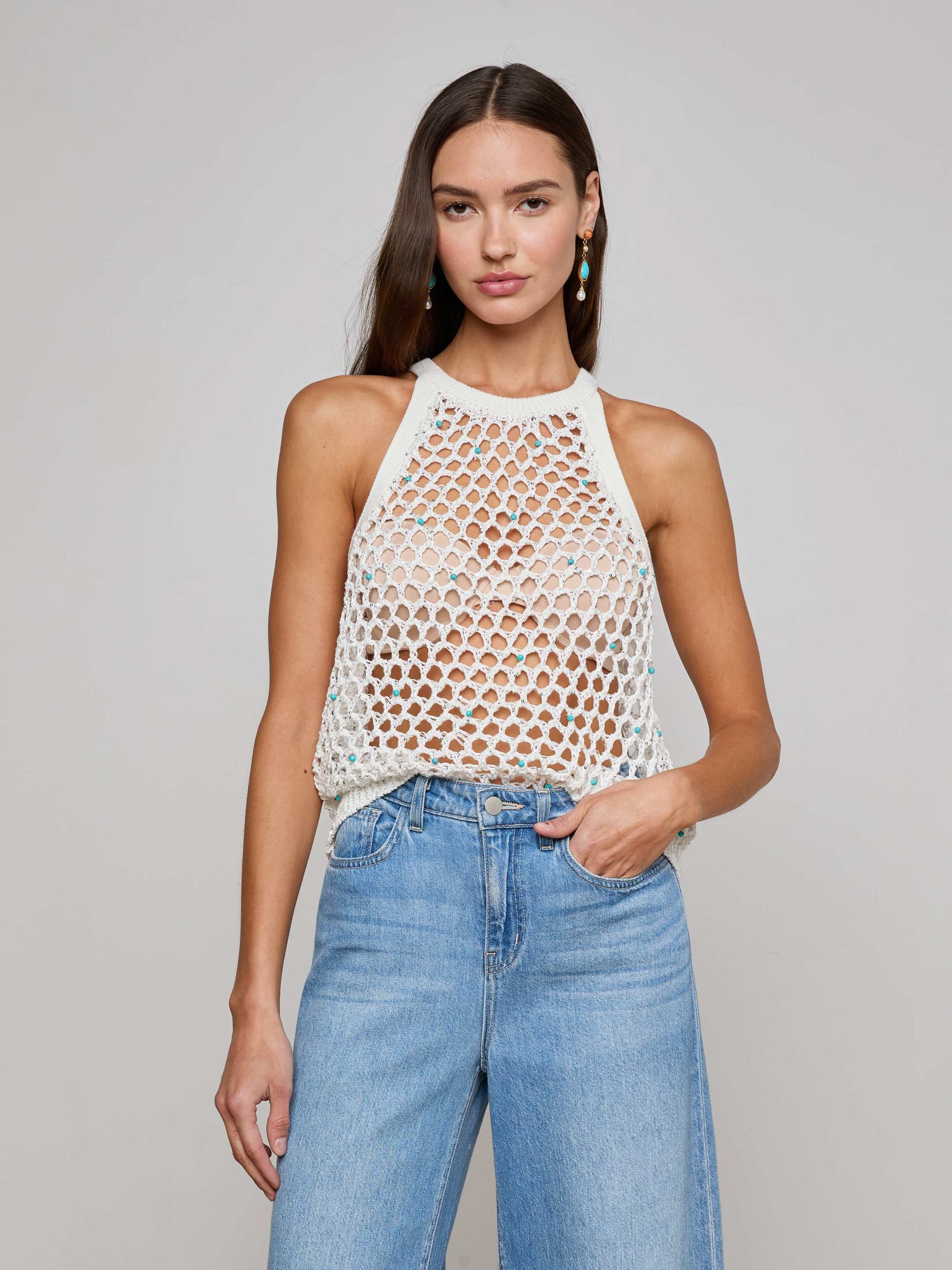 Complete your summer look with the Parmida—a crochet knit tank, featuring a large-scale diamond mesh pattern with delicate turquoise bead accents. We love this tank for beach days to nights out.