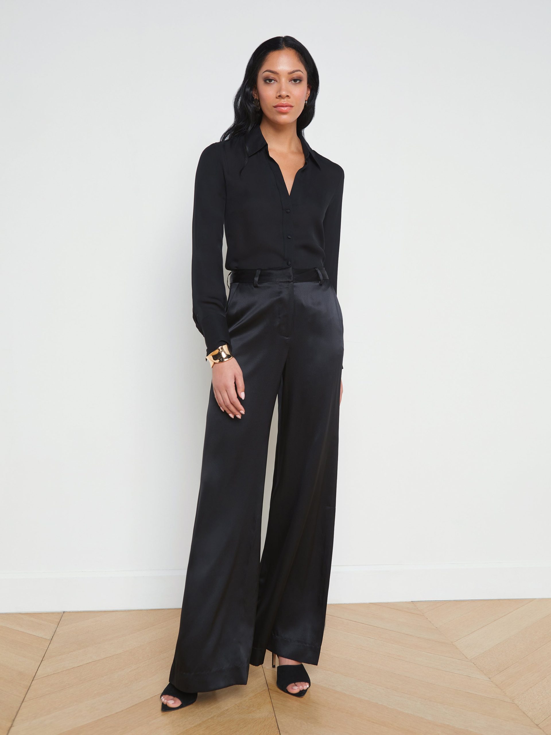She’s the supremely elegant silk pant, now in timeless black. The Pilar features a dramatic wide leg that accentuates her slim, defined waistband that includes a hidden hook-and-bar closure. Understated slit pockets blend seamlessly into the draped silhouette. Renewed each season in fresh fabrications and colorways, there’s a Pilar for every occasion. Add a blouse and heel for a refined evening look. Style No. 2625CHM-BLAC