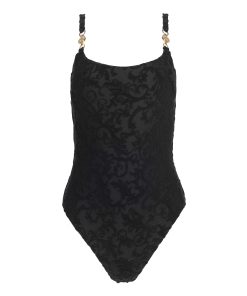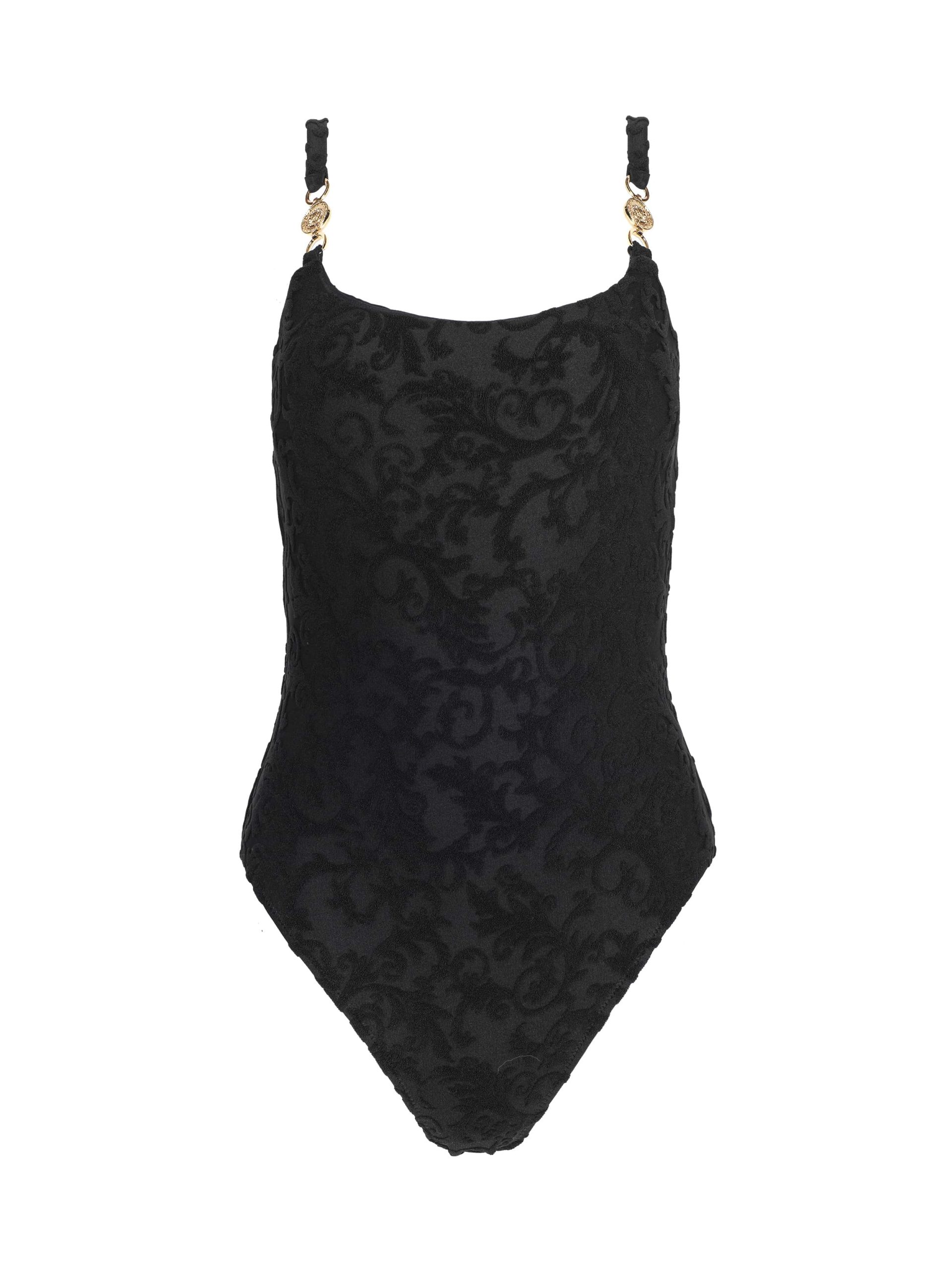 Our classic one-piece maillot swimsuit, now updated in an ornate terry design with gold coin hardware at the straps. The square neckline and high-leg cut give it a modern, sculpted edge—perfect for making a statement in and out of the water.