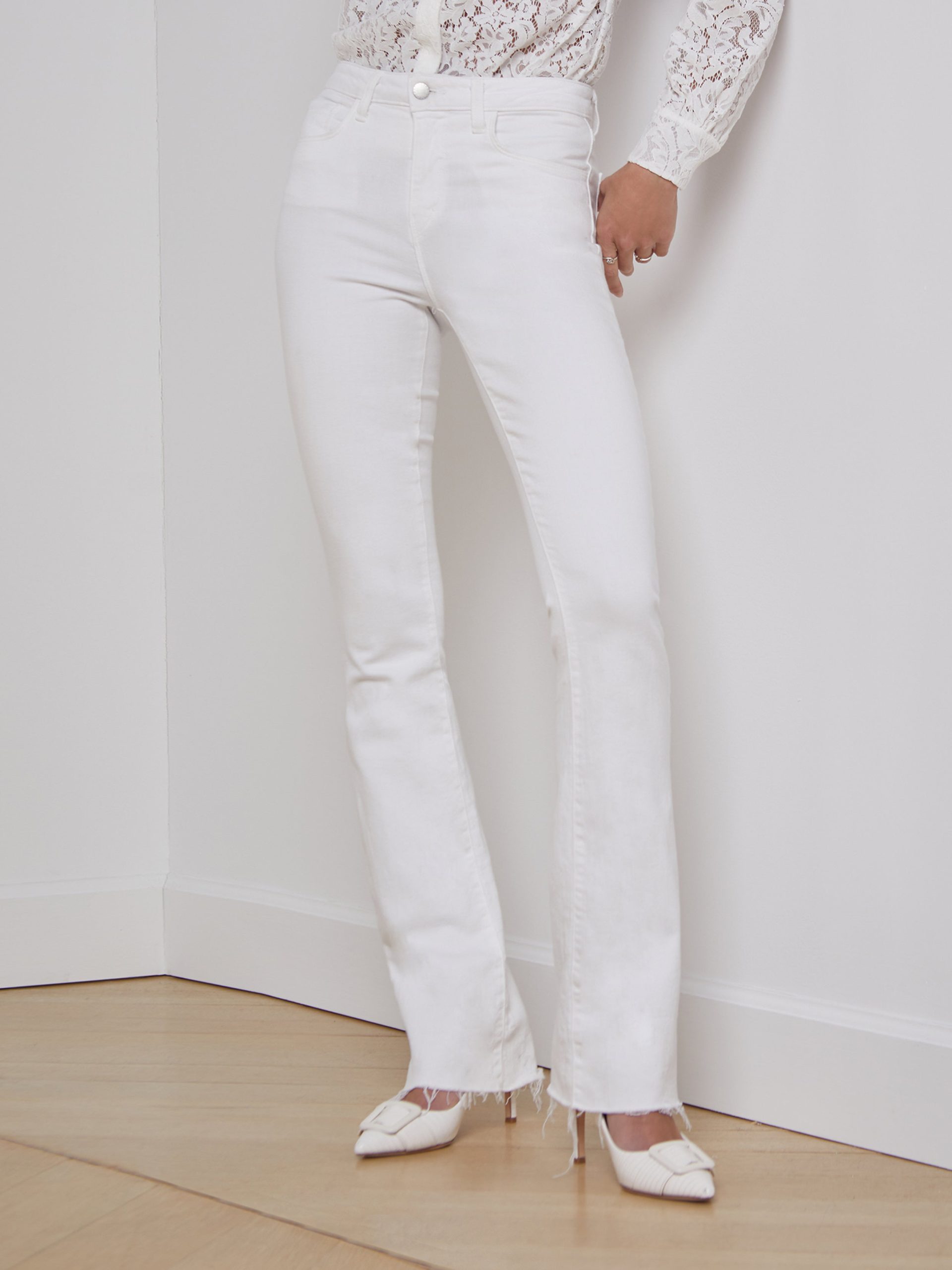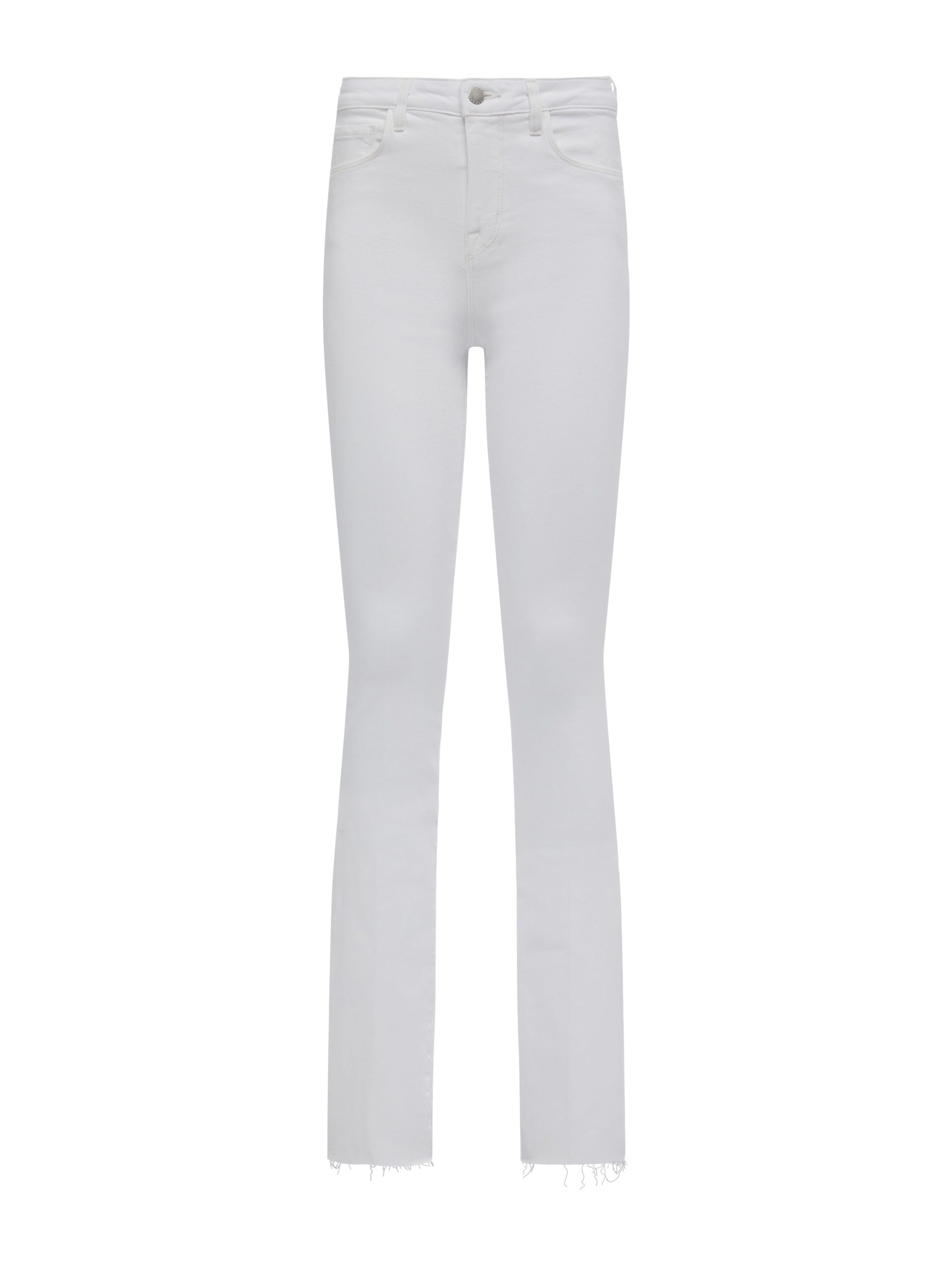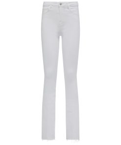 A classic high-rise jean in premium stretch denim and a bright-white hue. With a flattering contoured waistband, style is fitted through hip and thigh before falling in a straight, slim leg to a clean raw hem. Includes 5-pocket construction and front zip fly closure. This style is thoughtfully designed with a raw hem for easy alterations. Style No. 2649ISKR-BLAN
