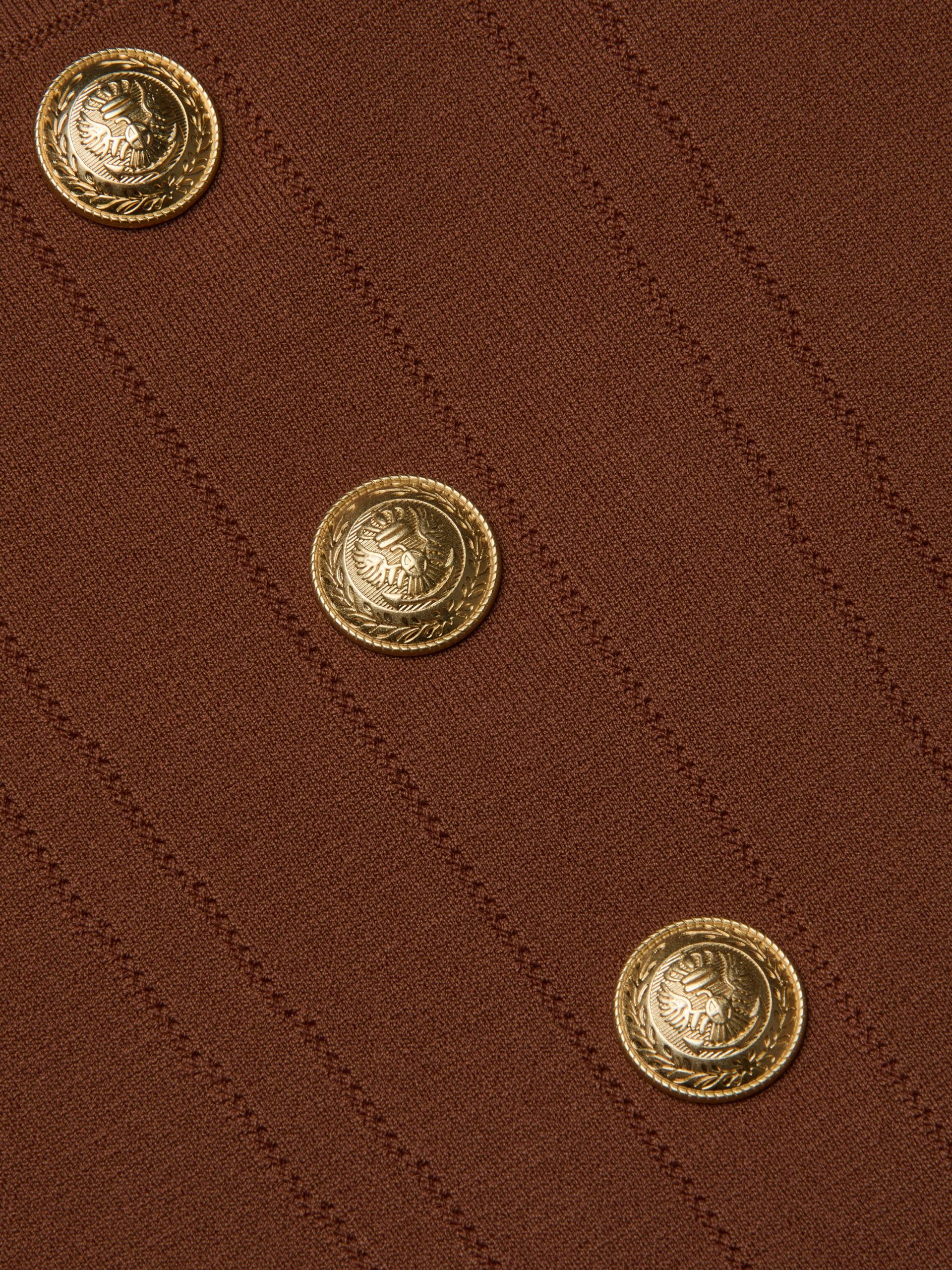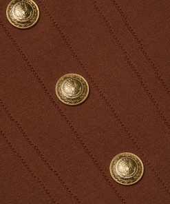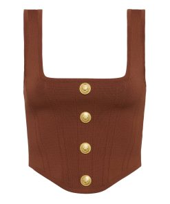 Our bestselling corset-inspired Saga top is back in a rich chocolate brown with gold buttons.