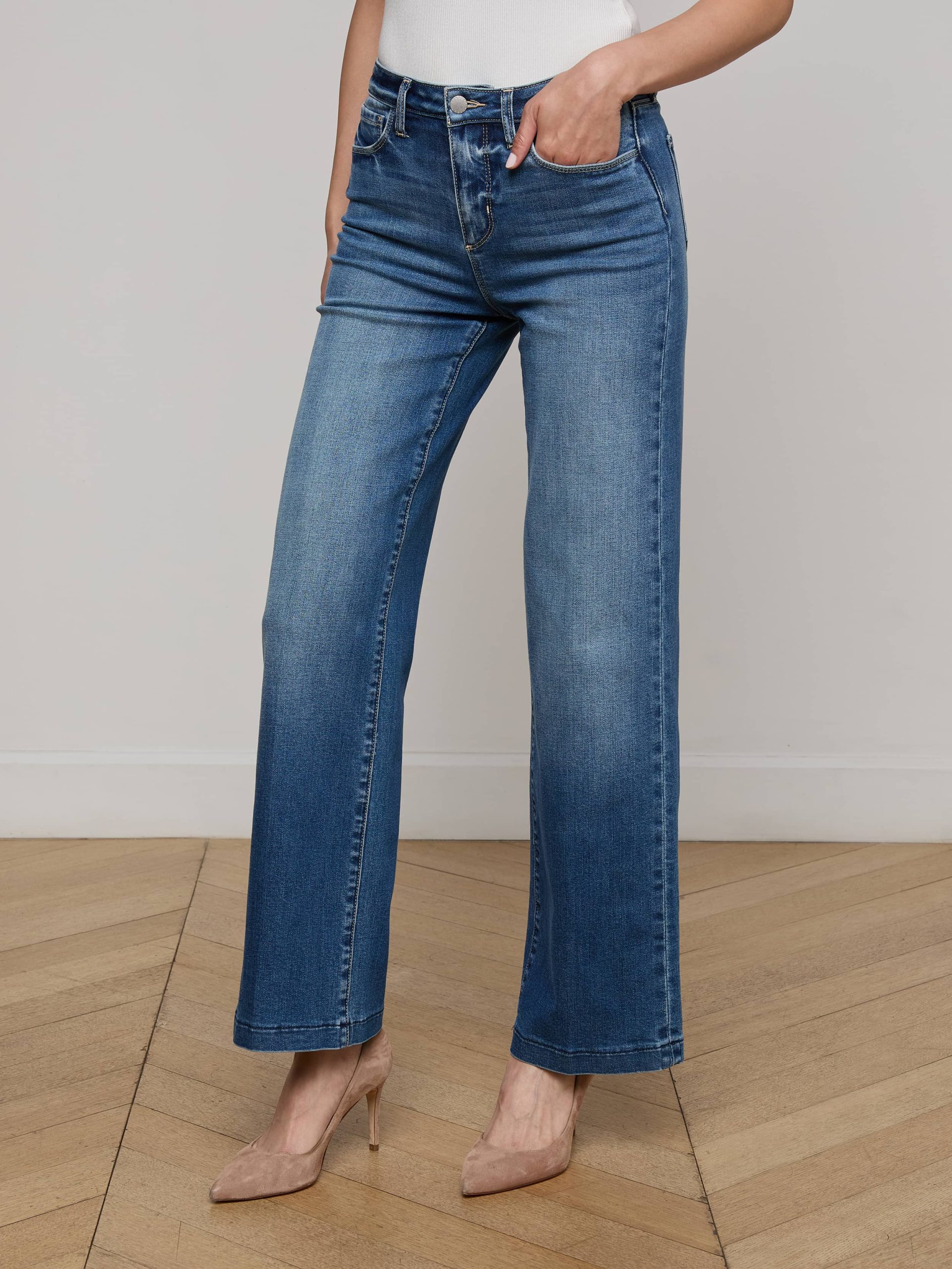 The Scottie is our classic wide-leg jean. This silhouette runs fitted and flattering through the hips and upper thigh before releasing to a relaxed wide leg. A contoured waistband sits securely at the natural waist without gaping. Now back in a timeless medium wash.