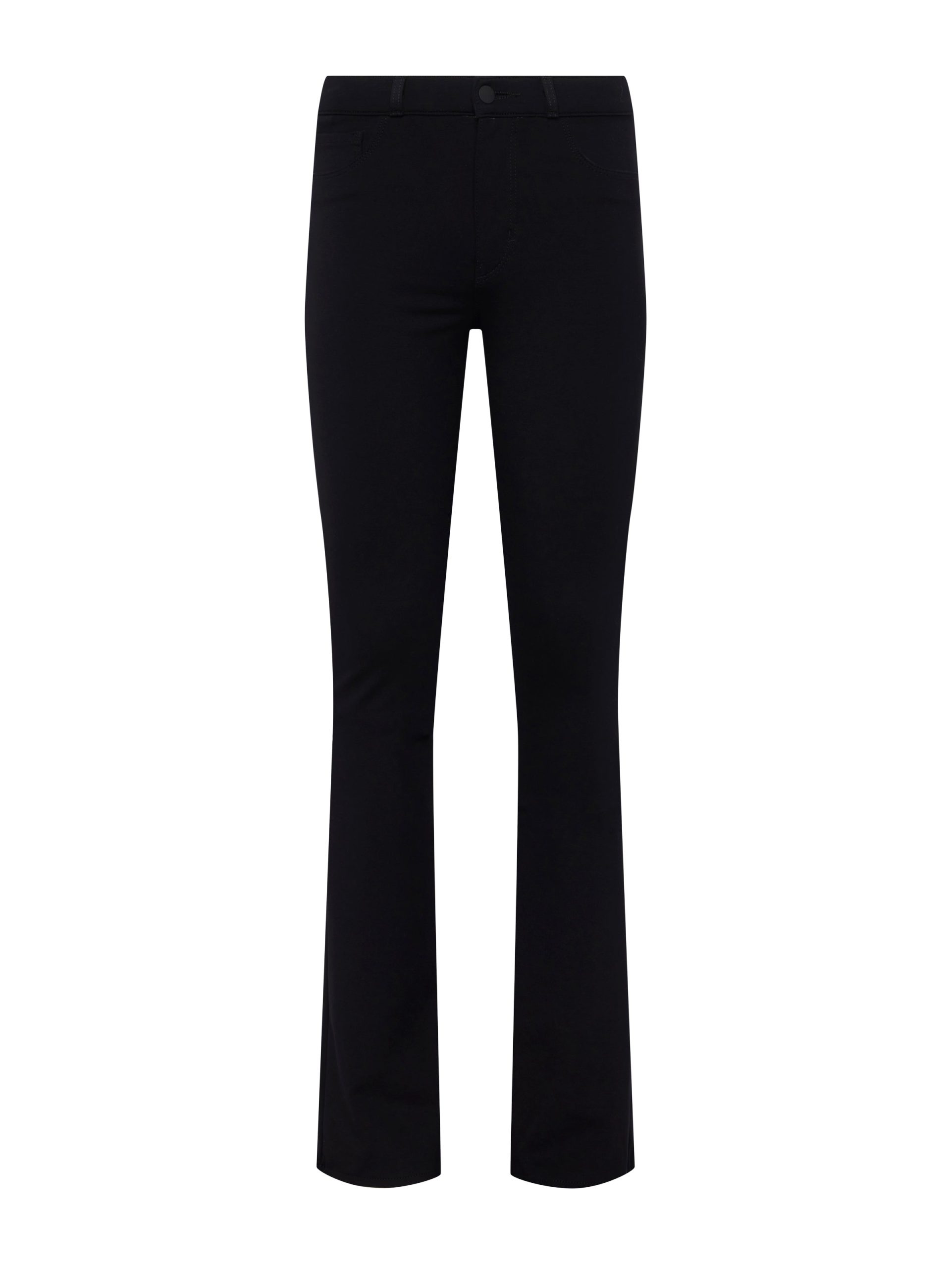 A classic high-rise bootcut pant in true-black ponte. Contoured waistband fits securely at natural waist, then hugs from hip to knee before releasing into a slim bootcut hem. High-recovery ponte holds its shape, smoothing the figure without sacrificing comfort. Classic five-pocket construction and zip fly closure. Style No. 2700APT-BLAC