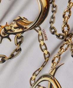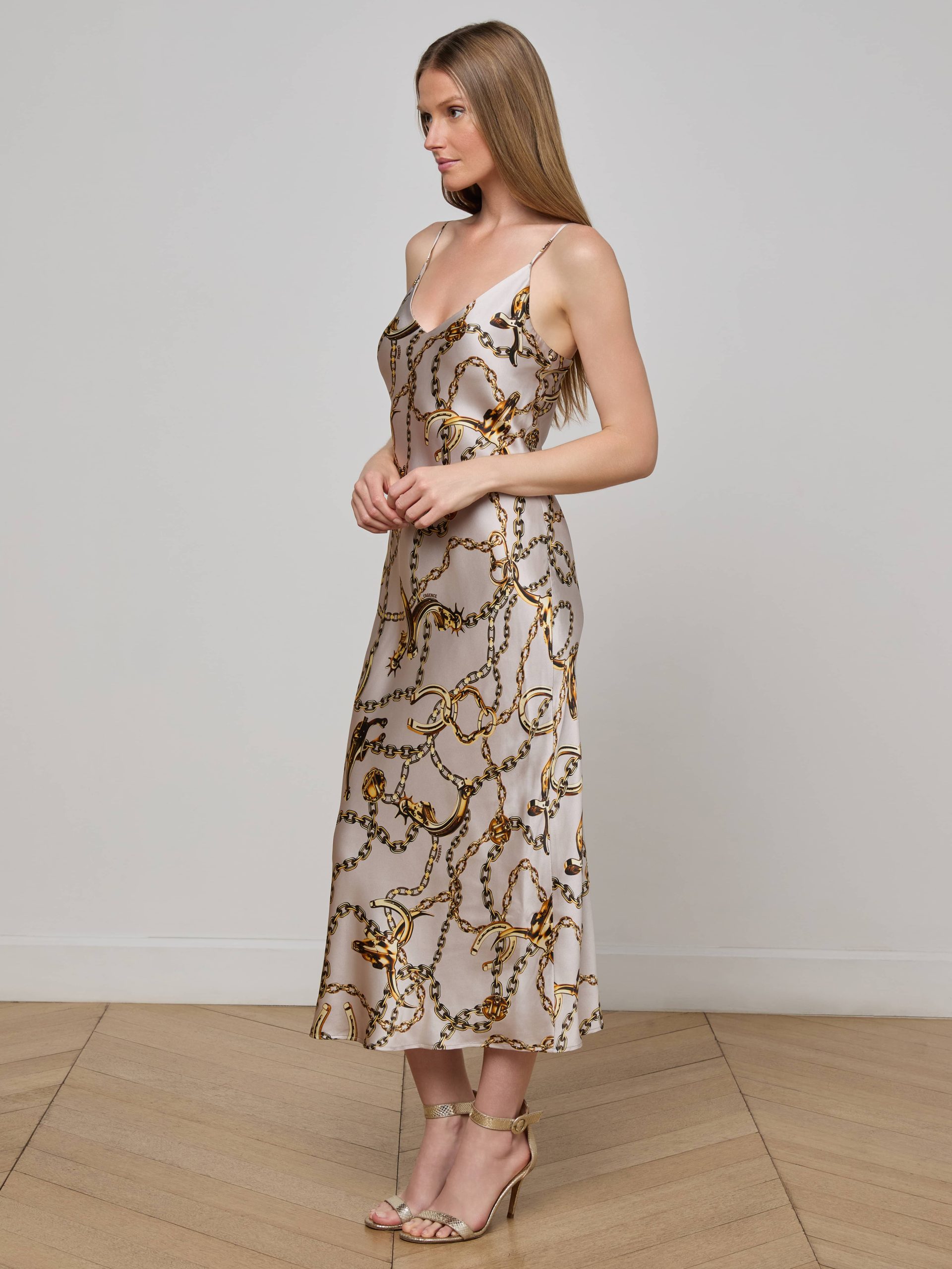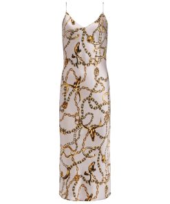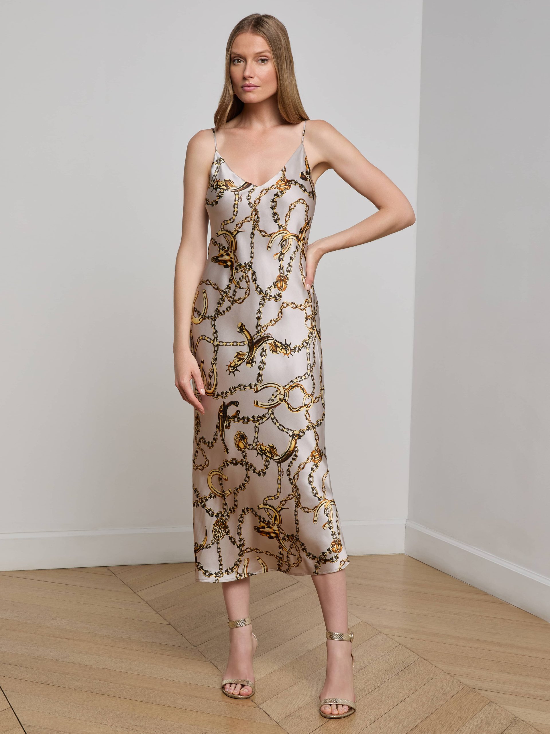 The iconic silk slip dress, offered in new colorways and prints each season. Now back in our gold horn and chain print.