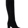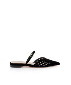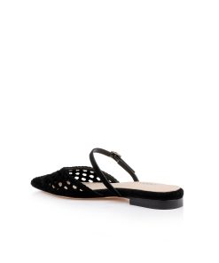 The Jacklyn is a pointed-toe flat mule, ideal for easing into warmer weather. A woven suede upper adds breathability, while a sleek strap gives it support and a polished finish. In black suede.