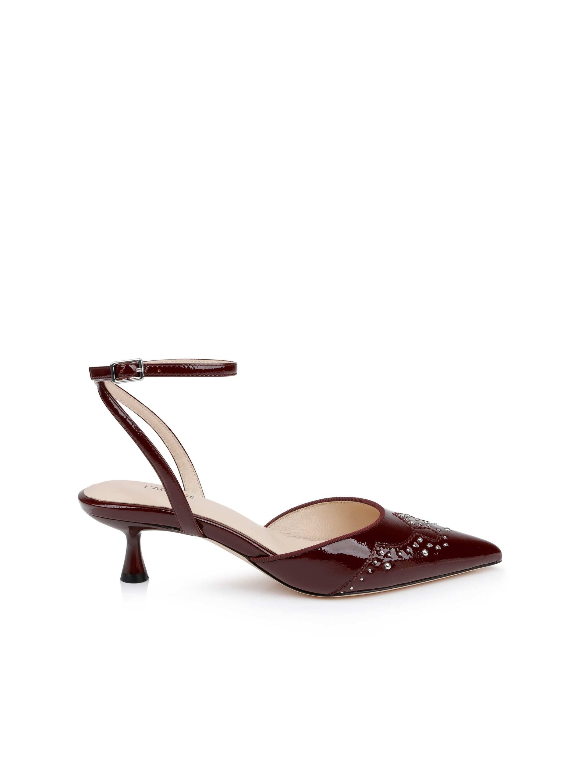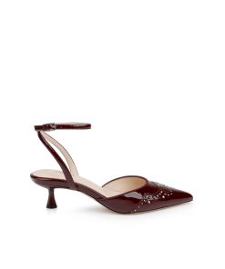 A chic kitten heel and delicate ankle strap give elegance to the Liana, while Western-inspired stitching and stud detailing add subtle edge. ln wine patent leather.