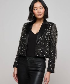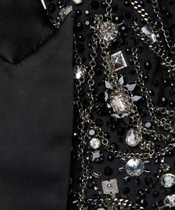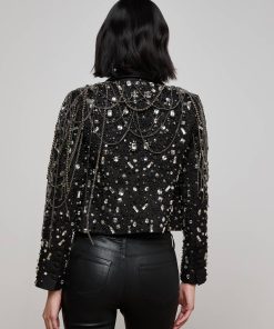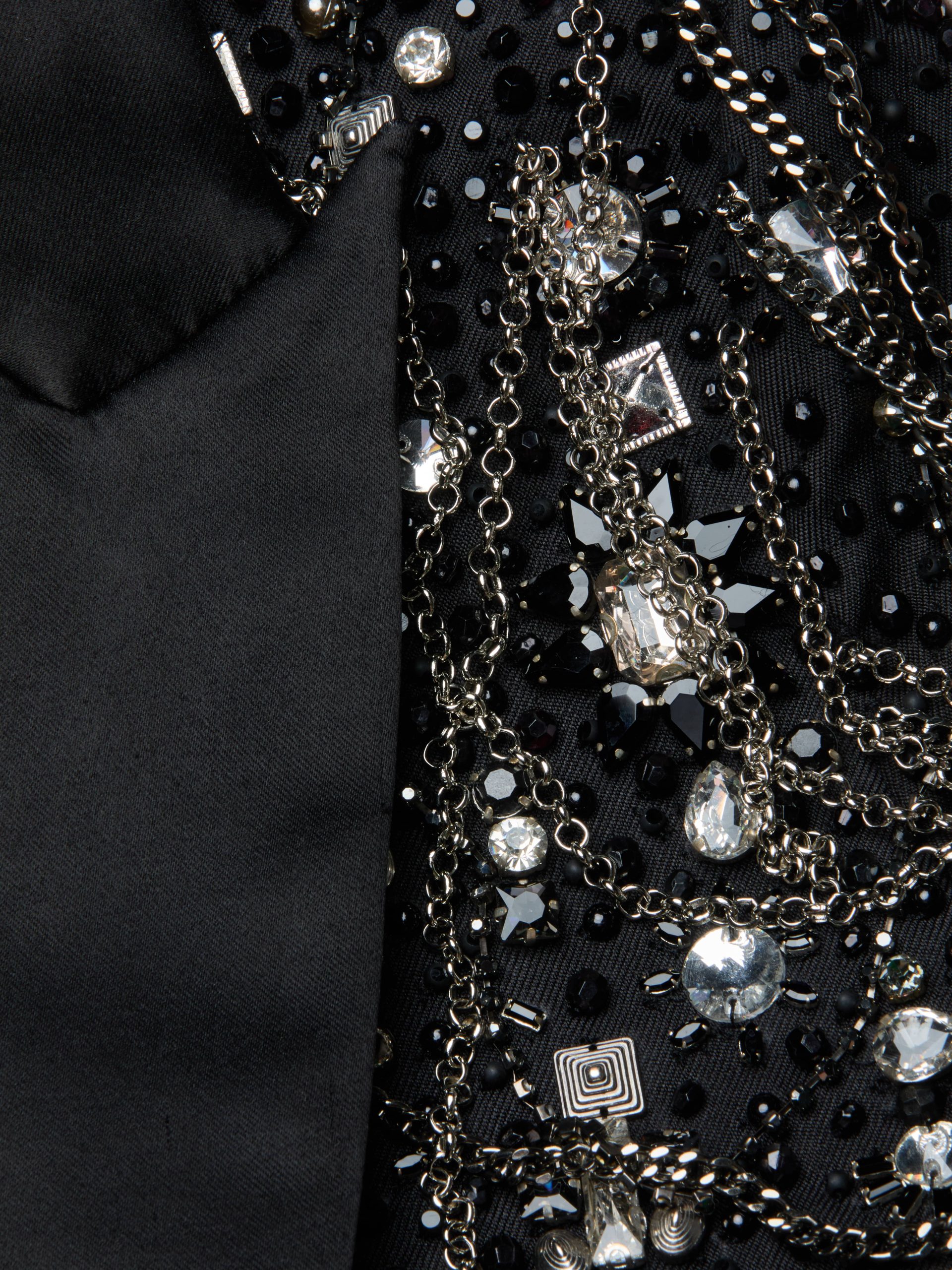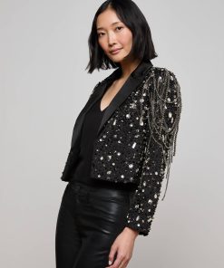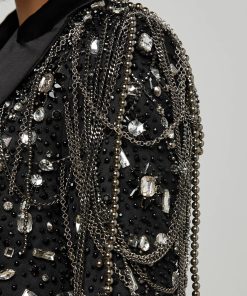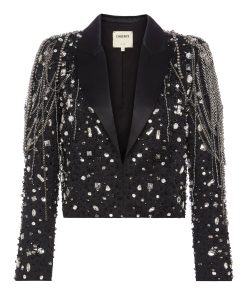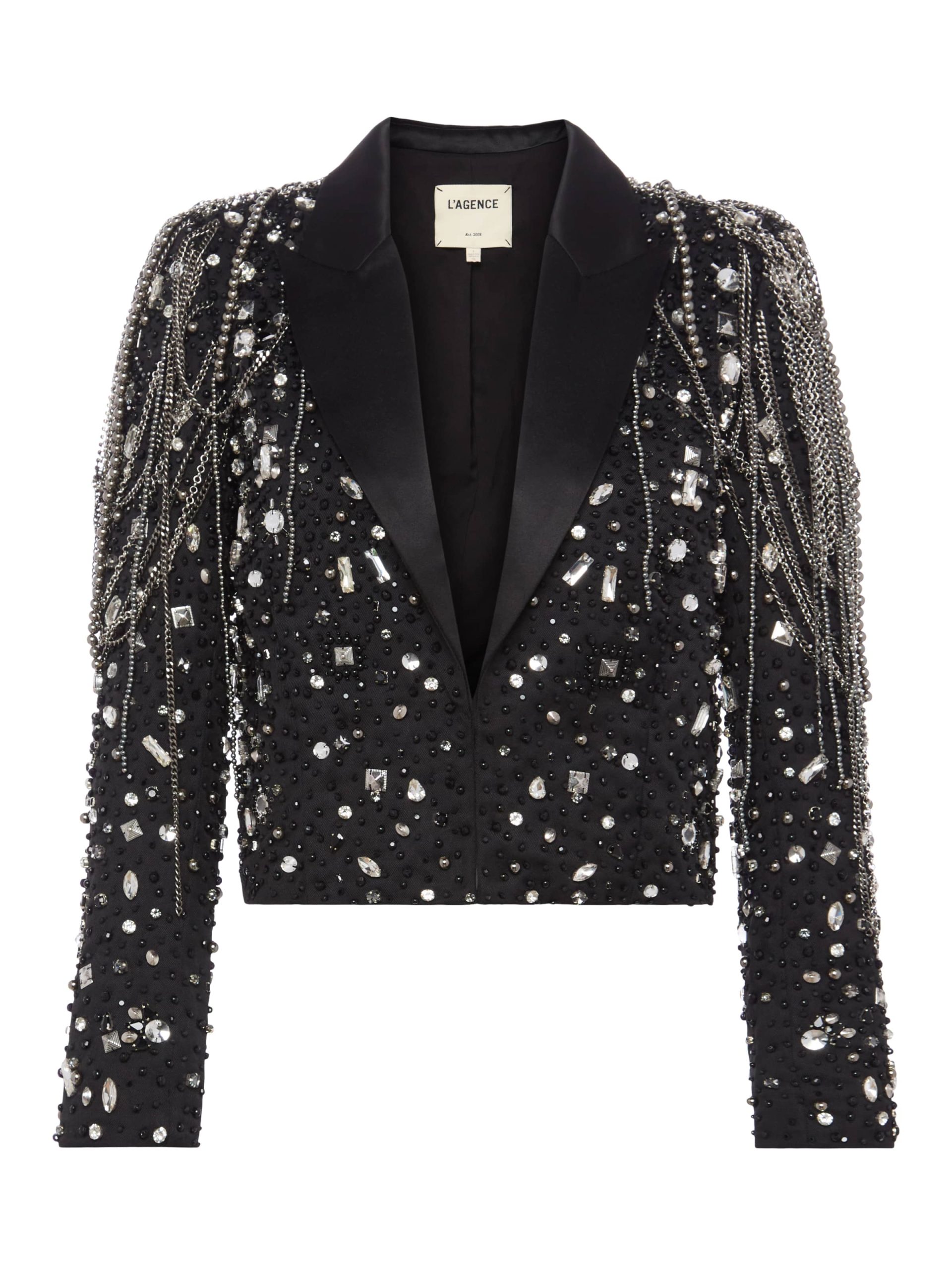 Constructed with hand-embellished crystals, silver chain fringe, and a satin lapel, the Soma delivers big on high-impact glamour. Layer it over a gown for your next event or wear it with a bodysuit and distressed jeans for unexpectedly sophisticated spin on the everyday look.