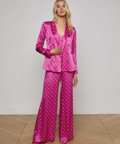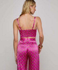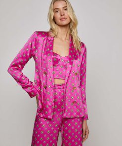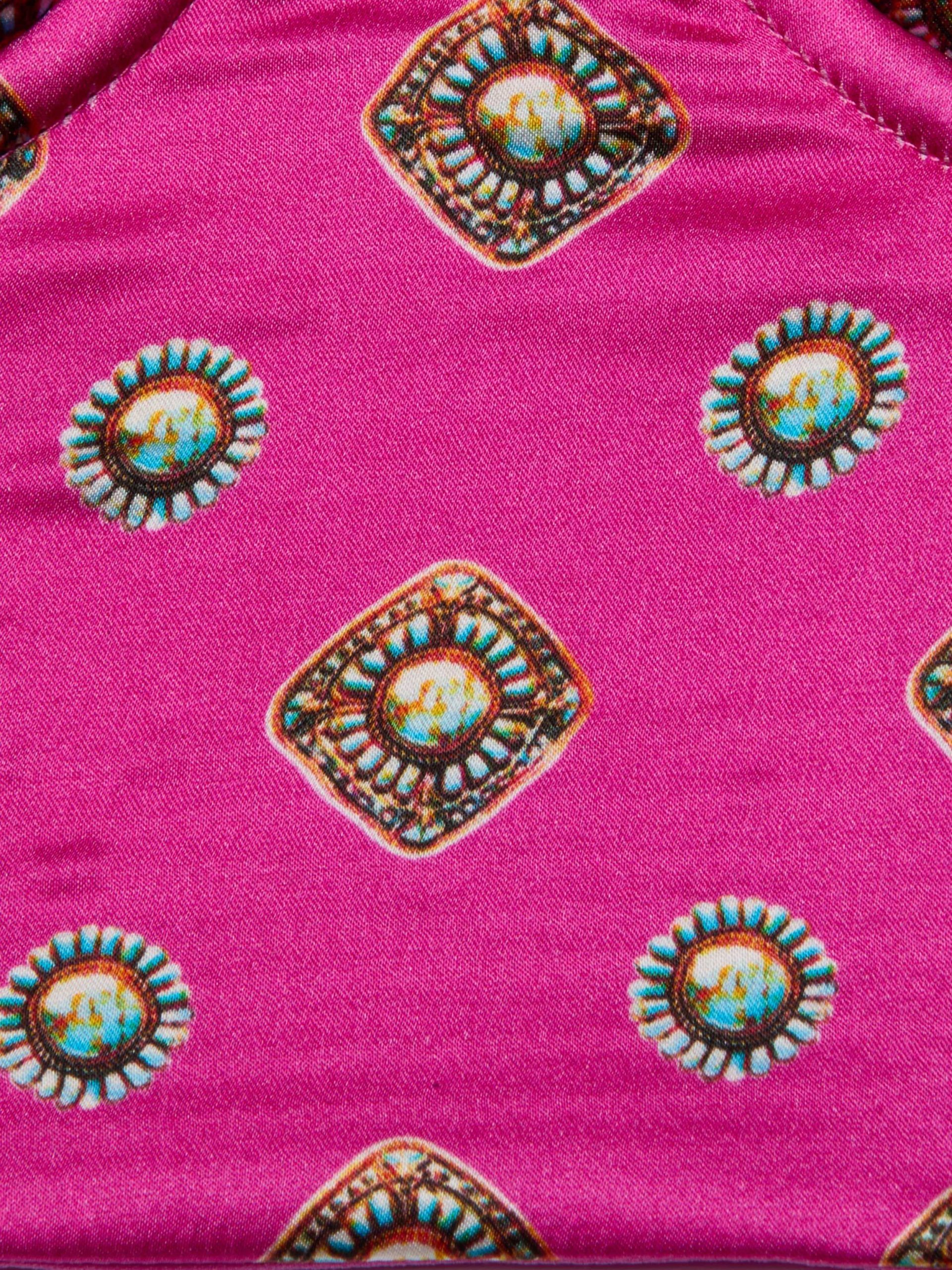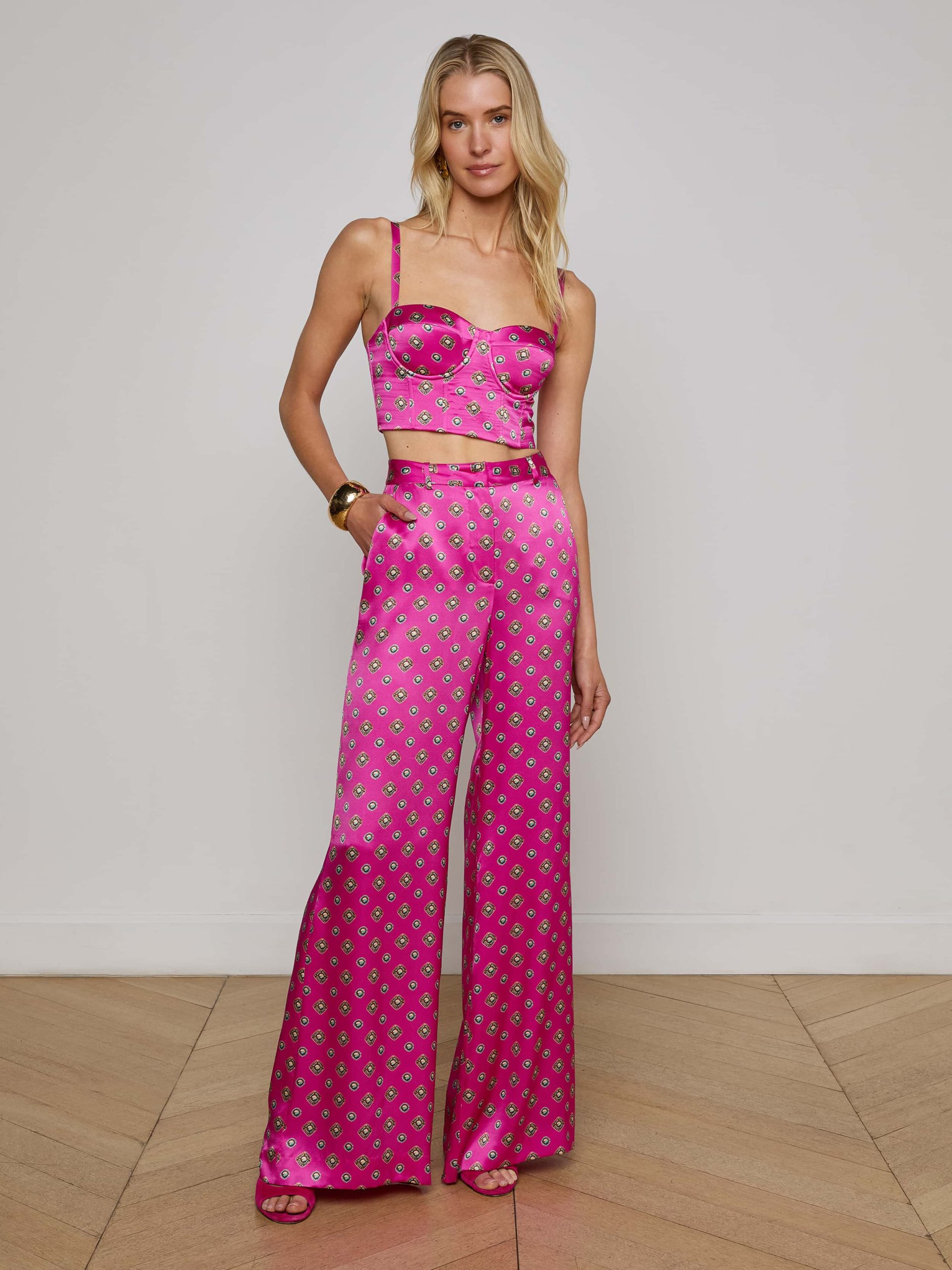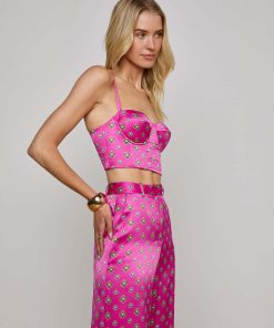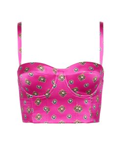 The Sonya is a pink silk bustier top, featuring a Southwestern-inspired print, structured cups, and a cropped silhouette. Wear it with the coordinating Colin blazer and Pilar pant for a modern approach to suiting, or pair it with your favorite jeans for a summer night out.