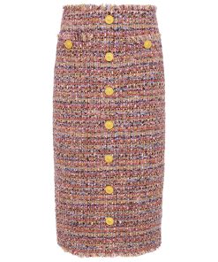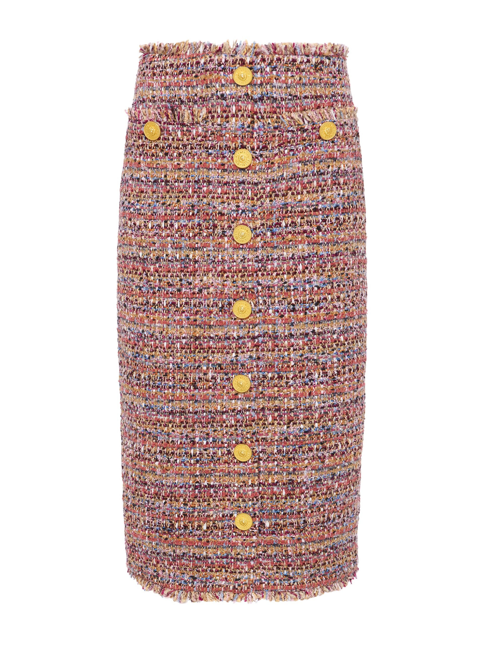 A classic pencil skirt reimagined colorful tweed. Finished with gold buttons and a delicate fringe trim, the Tai channels timeless polish with a playful twist.