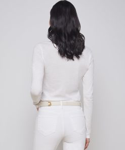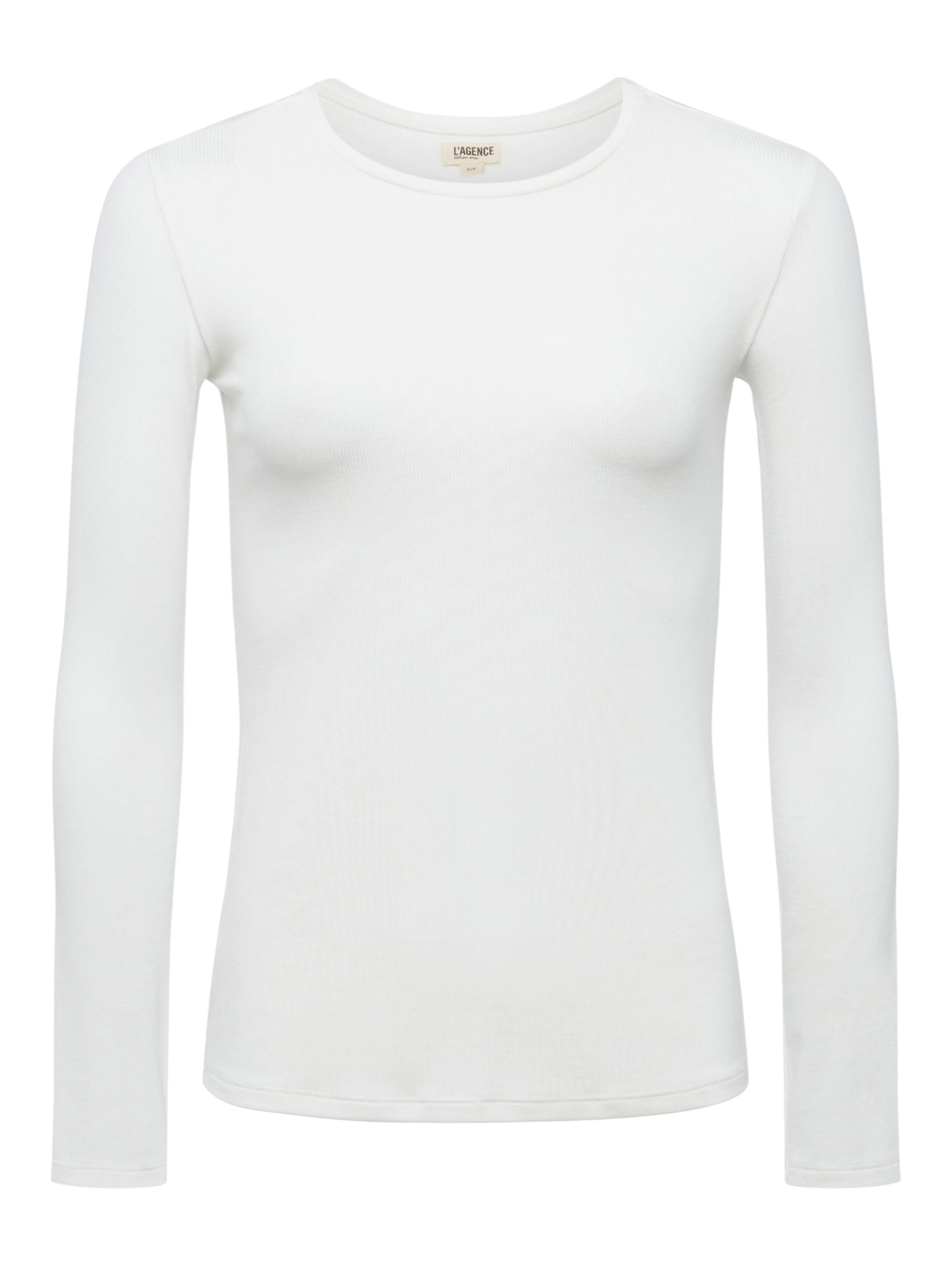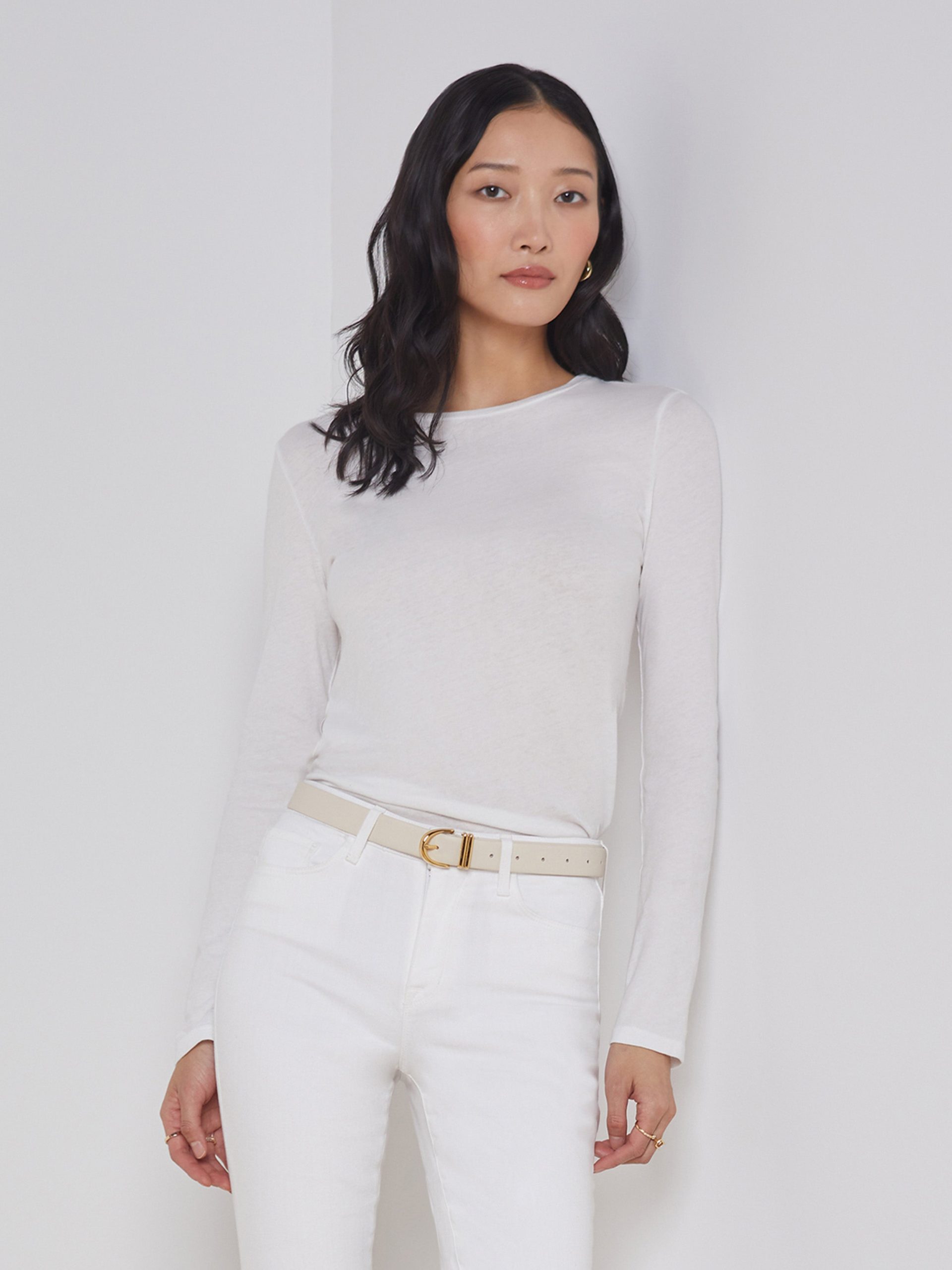 Modern and elegant slim-fit top in white. Ultra-soft microfiber jersey has a luxuriously silky hand and clings lightly to the figure. Look includes crew neck and sleek long sleeves. Beautiful wardrobe stable that works on its own or as a base layering piece. Style No. 5491MJT-WHIT