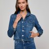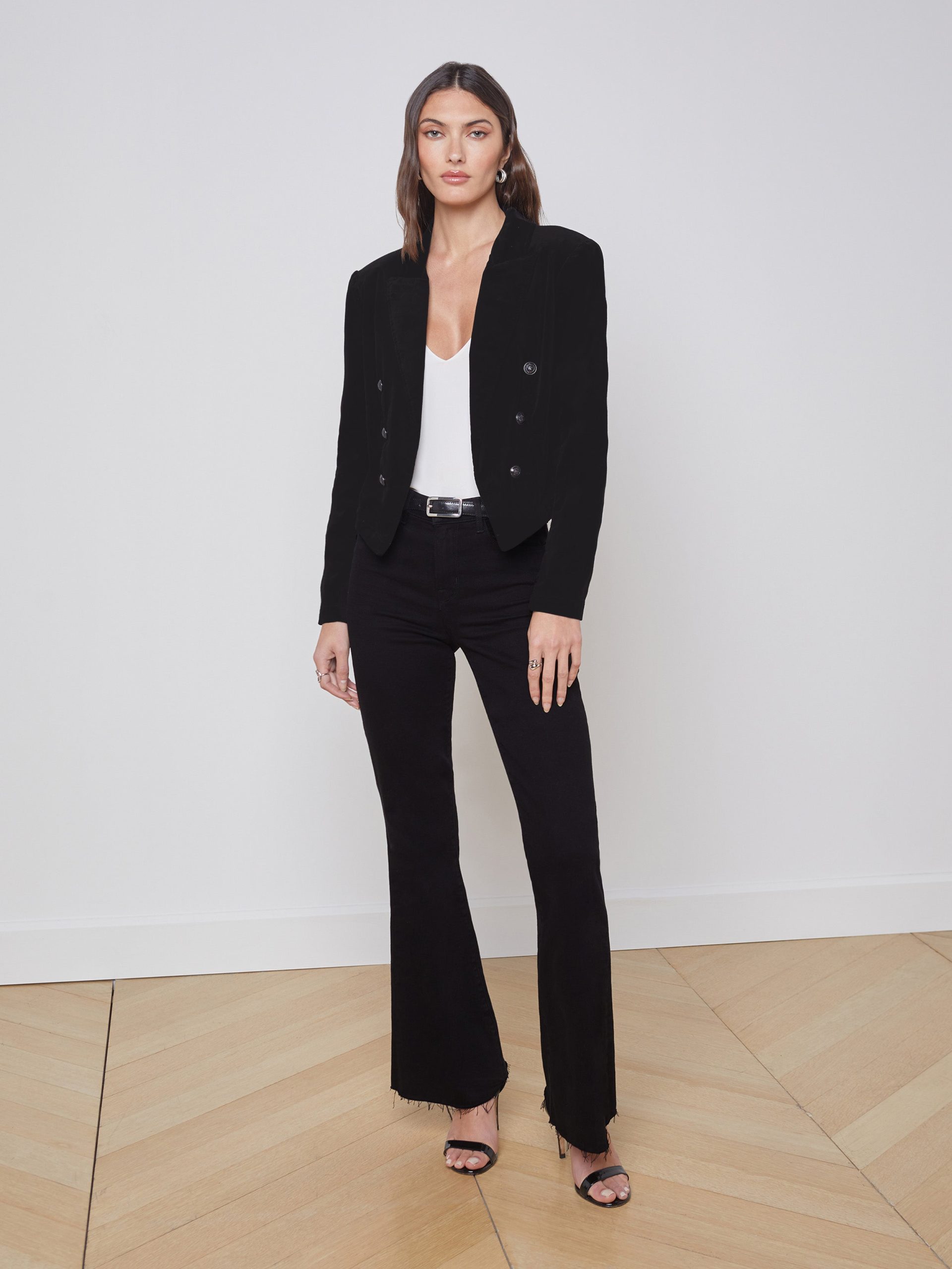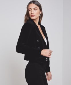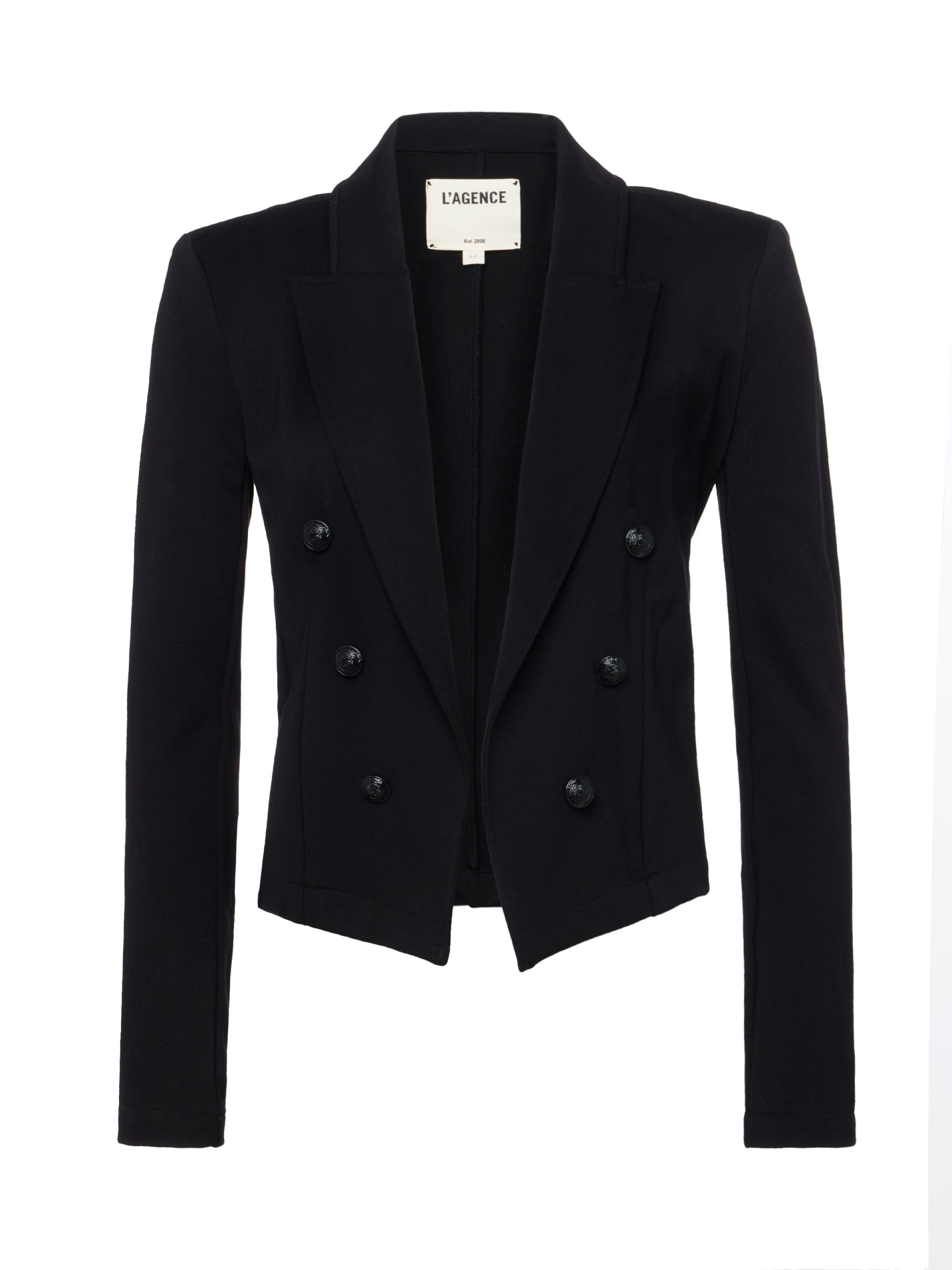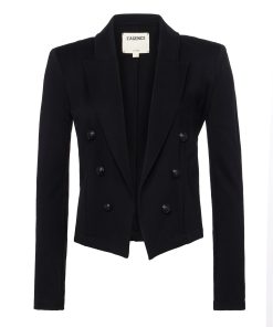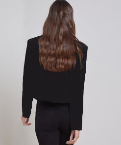 A polished open-front seersucker jacket in black. Sartorial details include strong shoulders and peaked lapels. Seaming tapers style to waist, creating a feminine silhouette. Finished with tonal embossed-dome accent buttons. No closures. Style No. 1750APT-BLAC