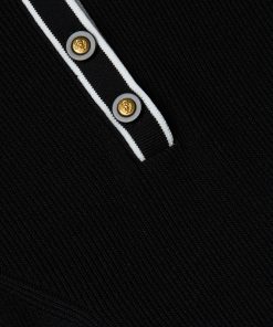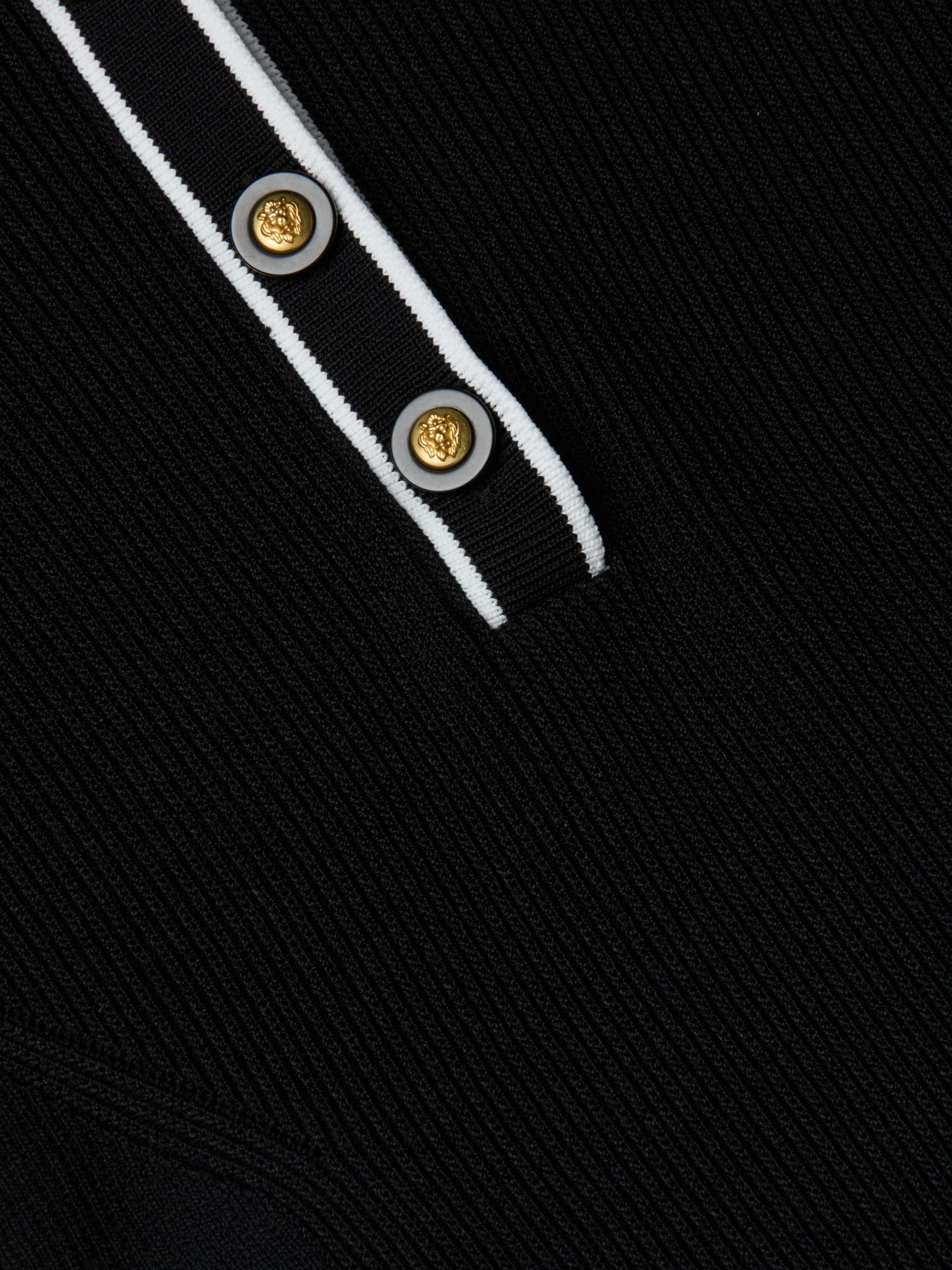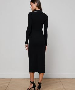 Sleek and sculpting, this power knit midi dress features a polished collar and bold contrast trim. The pop of turquoise buttons adds chic visual interest—perfect for the office and beyond.