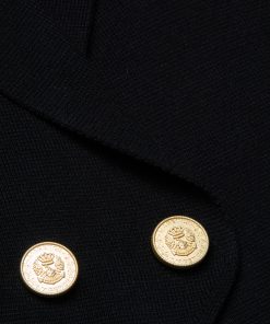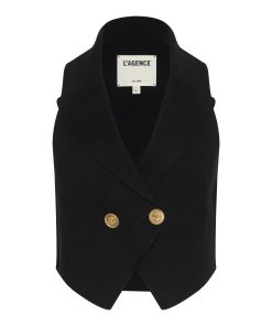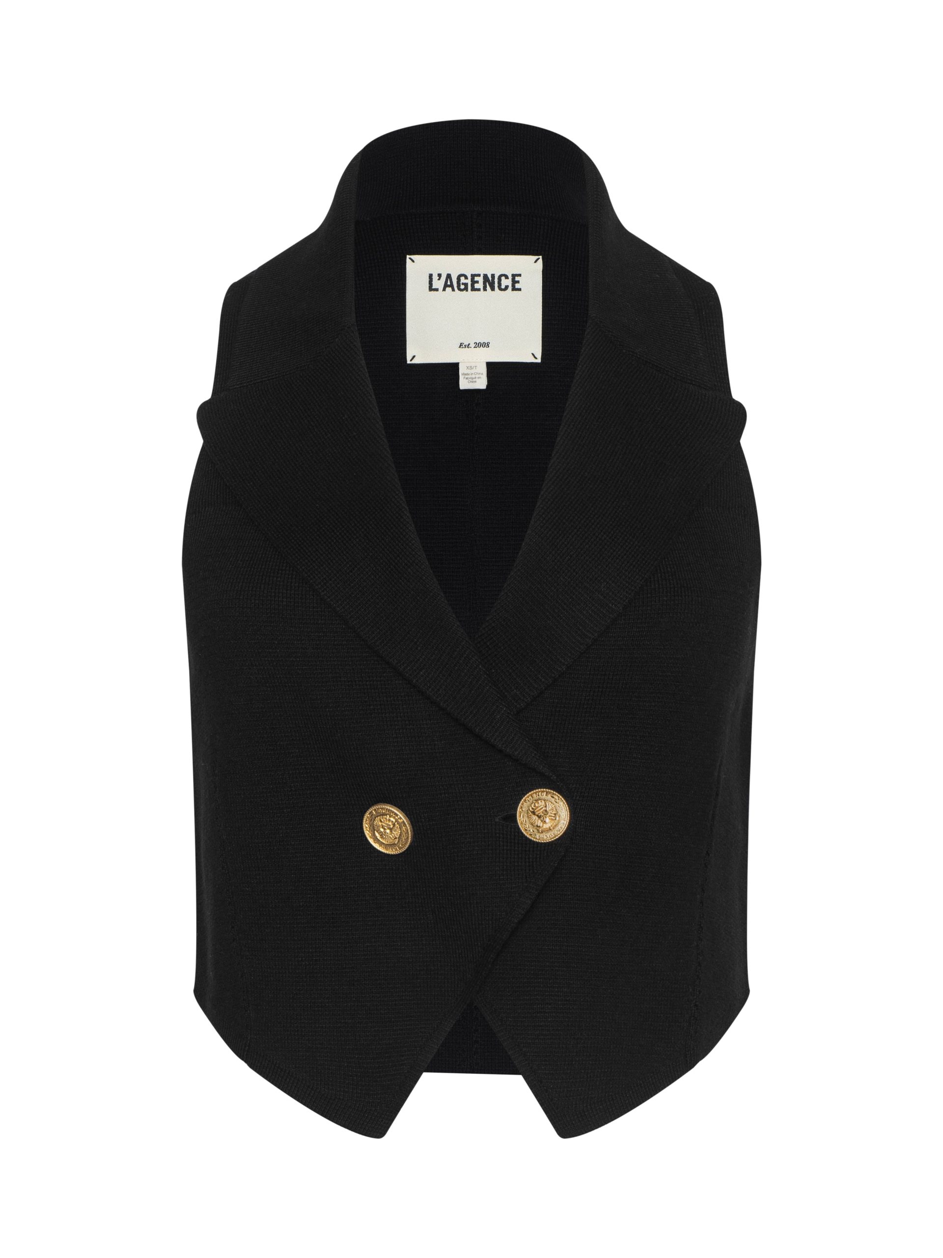 A fresh take on minimalist glamour. Crest buttons and a wide lapel elevate this little knit vest. Wear it as a top or layer it over a button-down shirt. Now in timeless black.